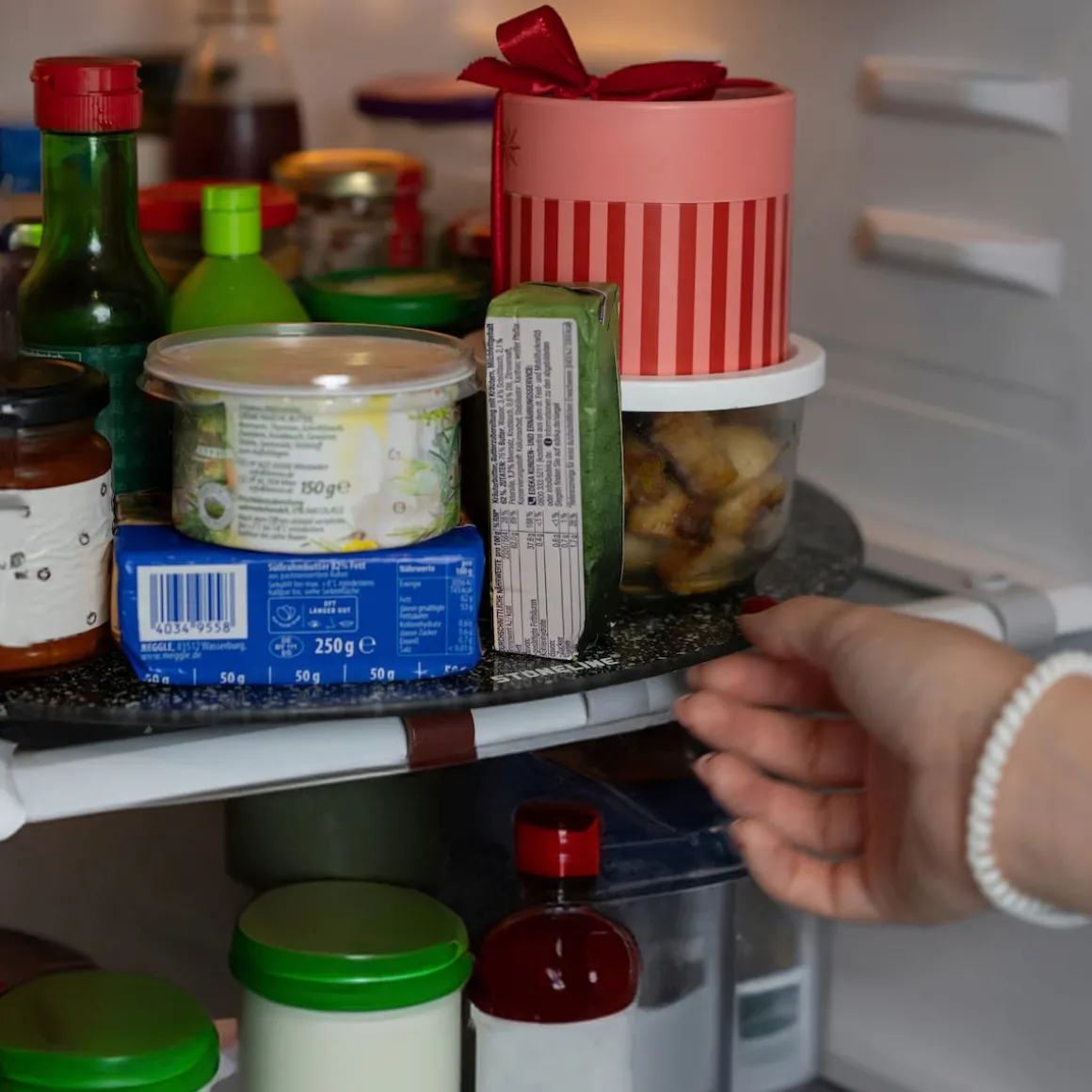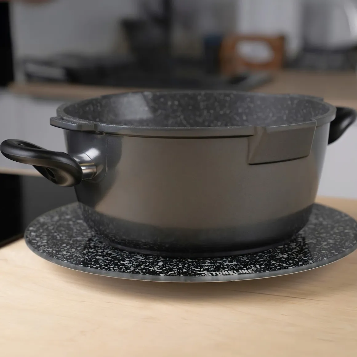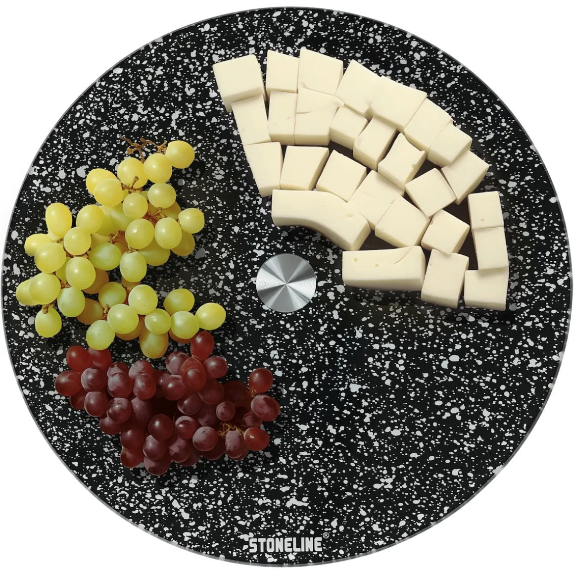 STONELINE – Das Original! Unsere drehbare Servierplatte aus Glas ist mit einem Durchmesser von 32 cm ideal für Familienessen, Partys und besondere Anlässe. Durch das zeitlose Design passt sie zu jedem Küchen- und Esszimmer-Ambiente. Der Drehteller ist nicht nur zuhause ein tolles Accessoire. Auch im Büro oder bei Veranstaltungen können darauf Vorspeisen, Hauptgerichte oder Desserts stilvoll und praktisch präsentiert werden. Die leichtgängige 360-Grad-Drehfunktion ermöglicht, alle darauf platzierten Speisen bequem zu entnehmen. Ob für Buffets, Käseplatten, Sushi oder Desserts – alles ist sofort griffbereit. Sie können den Servierteller auch als Topfuntersetzer für heiße Pfannen, Töpfe oder Auflaufformen benutzen. Gefertigt aus robustem, bruchsicherem Glas, ist diese Servierplatte nicht nur optisch ansprechend, sondern auch langlebig und widerstandsfähig. Der rutschhemmende Standfuß sorgt für einen sicheren Halt und verhindert Kratzer auf empfindlichen Oberflächen. Die glatte Oberfläche macht die Glasplatte sehr hygienisch. Sie ist geruchsneutral und kann einfach mit einem feuchten Tuch abgewischt werden. 1 Servierplatte aus Glas, ø ca. 32 cm, Stärke Servierplatte: ca. 2,5 mm, Gesamthöhe: ca. 2,6 cmDesign: STONELINE Die wichtigsten Vorteile auf einen Blick: Viele Verwendungsmöglichkeiten: Schneiden, vorbereiten, anrichten, servieren Auch als Topfuntersetzer geeignet Zeitloses Design Mit rutschhemmendem Standfuß Hygienisch und geruchsneutral Leicht zu reinigen dank glatter Oberfläche Material Servierplatte: bruchstabilisiertes Glas