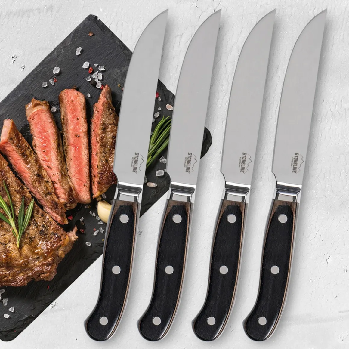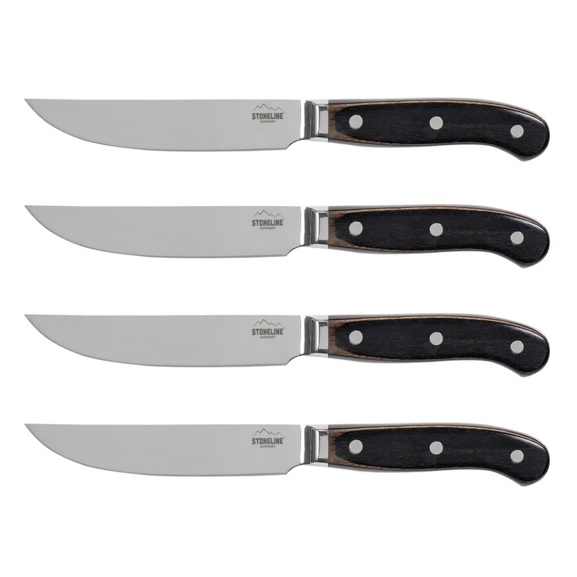 STONELINE – Das Original! Das Grillen gilt längst nicht mehr als reines Schönwetter-Vergnügen, sondern hat sich zur beliebten Ganzjahresaktivität entwickelt. Das Premium Steakmesser-Set ist der ideale Begleiter, um sein Grillgut in vollen Zügen genießen zu können. Die Messer schneiden jedes noch so dicke Steak, Kotelett oder Hähnchen mit Leichtigkeit. Bereiten Sie Grillgemüse, Salate und andere beliebte Grillgerichte ganz einfach vor. Zerkleinern, schneiden, hacken – dank der scharfen Klinge aus hochwertigem geschmiedetem Chrom-Molybdän-Vanadium-Edelstahl (X50CrMoV15) erledigen Sie diese Arbeiten mit purem Vergnügen. Der durchgängige Metallkern im Griff liefert perfekt ausbalancierte Messer, die dank des ergonomischen Griffes eine angenehme Handhabung und einen sicheren Halt ermöglichen. Durch ihre vielseitigen Einsatzmöglichkeiten bereitet die Verwendung diese Messer in jeder Küche Vergnügen. Reinigen Sie die hochwertigen Messer bitte wie jede andere Profi-Messer mit Hand und nicht im Geschirrspüler: auf Grund der hohen Temperaturen und den aggressiven Reinigern, sollten Messer nicht in die Spülmaschine. Durch die Handreinigung erhalten Sie ihre Qualität und Schärfe bestmöglich und werden lange Freude daran haben. Sollten Ihre Messer doch mal etwas mehr Schärfe benötigen, dann schaffen Sie diese mit dem im Set enthaltenen Schleifstein mit 2 verschiedenen Körnungen. Verschenken Sie diese Freude auch gerne, denn das Messer-Set wird in einer edlen Holzbox geliefert. 4 Steakmesser, Gesamtlänge ca. 23,2 cm, Klingenlänge ca. 12,3 cm1 Schleifstein mit zwei Schleifstärken1 Aufbewahrungsbox aus Holz Die wichtigsten Vorteile des STONELINE Steakmesser-Sets auf einen Blick: Aus hochwertigem, rostfreiem Chrom-Molybdän-Vanadium-Edelstahl (X50CrMoV15) Ergonomischer Griff für ein sicheres und rutschfestes Schneiden Durchgängiger Metallkern im Griff für perfekte Balance Mit Schleifstein Leicht zu reinigen Ideal als Geschenk-Set: Lieferung in hochwertiger Holzverpackung Material Klinge: Edelstahl