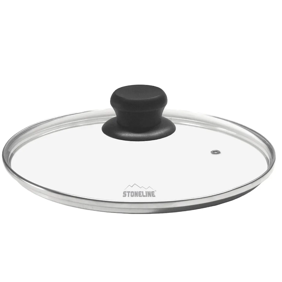 STONELINE – Das Original!Glasdeckel mit EdelstahlrandPassend für Töpfe und Pfannen der Marke STONELINE und weitereø ca. 24 cmMit AbdampfventilMit hochwertigem schwarzen Deckelknauf aus Kunststoff