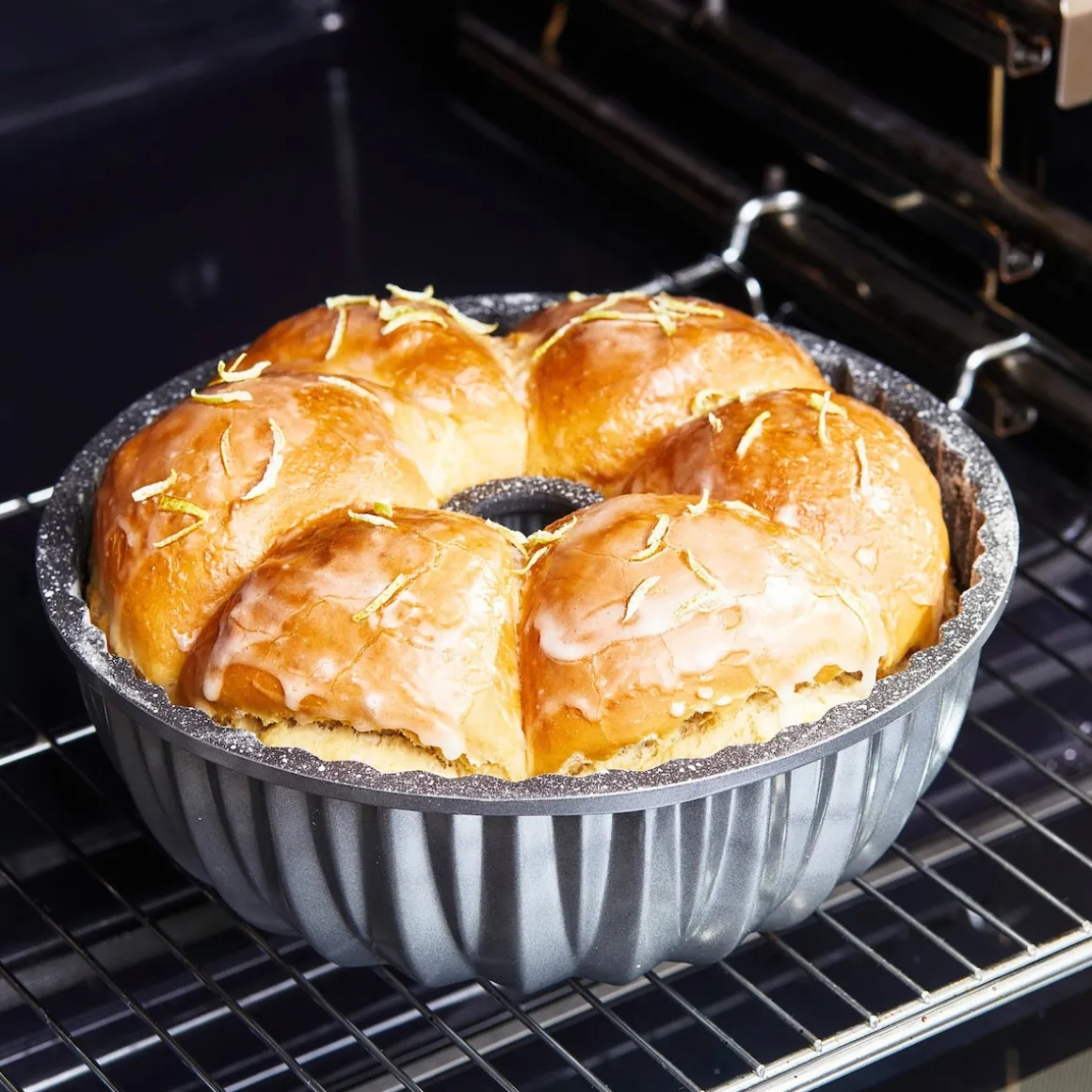 STONELINE – Das Original!Gesund fettfrei backen! Sie backen gerne Gugelhupf aber Ihnen bleibt der Kuchen immer in der Form kleben? Dann sollte diese Gugelhupf-Backform in Ihrer Küche nicht fehlen. Probieren Sie nicht nur das klassische Gugelhupf-Rezept aus, sondern testen Sie Backvarianten mit herzhaftem Teig oder sogar Aufläufe. Ihrer Kreativität sind keine Grenzen gesetzt. Durch die sehr gute Wärmeleitfähigkeit und das hochwertige Aluguss-Material erhalten Sie ein rundum knuspriges Backergebnis. Die robusten Backformen mit der original STONELINE-Beschichtung verhindern das Ankleben, sorgen für ein gleichmäßiges Backen und erlauben das einfache Herauslösen Ihres Backwerks. Es bleiben keine hartnäckigen Reste haften und die einfache Handwäsche spart Ihnen Zeit und Mühe. 1 Gugelhupf-Backform, ø ca. 24,5 cm, Höhe: ca. 9,0 cm, ca. 2,6 l Die wichtigsten Vorteile des STONELINE Backgeschirrs auf einen Blick: Weltweit einzige Antihaftbeschichtung mit echten Steinpartikeln Kratzfeste STONELINE-Antihaftbeschichtung Optimales Backergebnis Bester Geschmack Kein Anbrennen und kein Ankleben Super leicht zu reinigen Backofengeeignet bis 260 °C Material: Aluminiumguss Reinigungs- und Pflegetipps: Vor dem ersten Gebrauch empfehlen wir, Ihr Koch- oder Backgeschirr mit etwas Wasser und einem milden Spülmittel gründlich auszuwaschen.Verteilen Sie anschließend mit einem Papierküchentuch einige Tropfen Speiseöl auf der Beschichtung.Bei der weiteren Nutzung können Sie auf den Einsatz von Fett oder Öl verzichten!Dank dem Easy-Clean-Effekt wird die Reinigung per Hand empfohlen. Einfach mit heißem Wasser, Handspülmittel und einem weichen Schwamm auswischen.