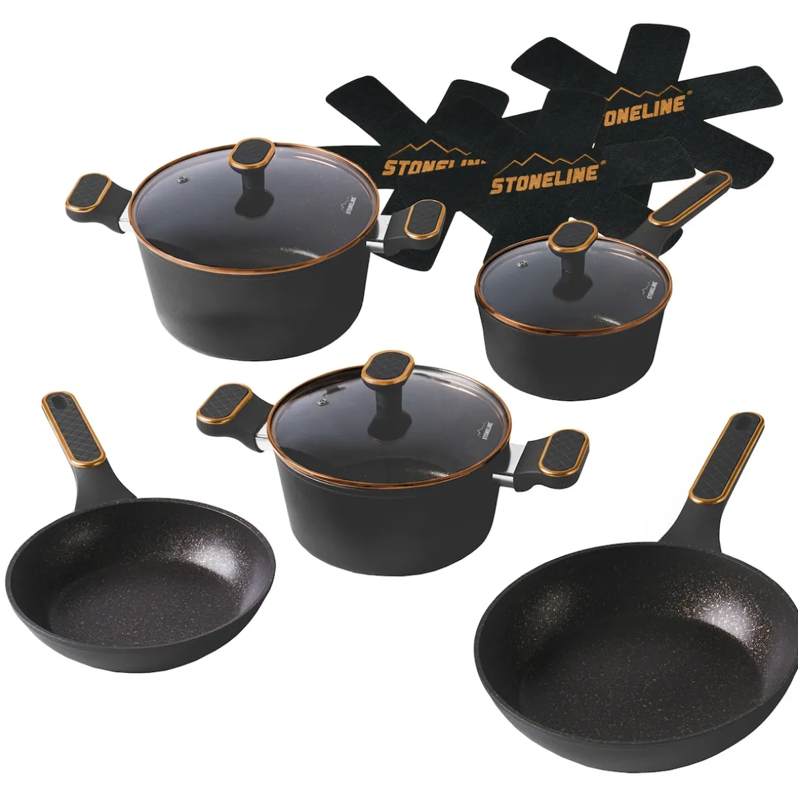 STONELINE – Das Original!Gesund fettfrei kochen und braten!Eleganz und Leidenschaft. Verleihe deiner Küche einen modernen, edlen Touch mit dem STONELINE Kochgeschirr-Set in Mattschwarz. Die eleganten Roségold-Details an den Deckeln und Griffen setzen stilvolle Akzente und bringen einen Hauch von Luxus in deine Küche. Die einzigartige Farbkombination von Mattschwarz und Roségold vereint schlichte Eleganz mit einem modernen, luxuriösen Design. Mit diesem Set machst du nicht nur dein Kochen noch mehr zum Erlebnis, sondern setzt auch ein Statement für modernes Design und stilvolles Kochen. Hol dir das perfekte Zusammenspiel aus Funktion und Ästhetik und lass deine kulinarischen Kreationen noch mehr glänzen!Dieses Set ist der perfekte Küchenhelfer für jeden Anlass. Egal, ob du schnell etwas braten oder ein aufwendigeres Gericht zaubern möchtest – mit den praktischen Töpfen, Pfannen und Deckeln hast du immer das richtige Kochgeschirr zur Hand und die Zubereitung deiner Lieblingsgerichte macht doppelt soviel Spaß.Die Glasdeckel mit Edelstahlrand in Roségold sind eine großartige Ergänzung zu deinem Kochgeschirr. Der Knauf der Deckel bleibt angenehm kühl, damit du dich während des Kochvorgangs nicht verbrennst. So wird das Kochen noch komfortabler und sicherer!Mit diesem Kochgeschirr-Set kannst du dich auf jede Mahlzeit freuen, die du mit Liebe und Kreativität zubereitest. Es bringt nicht nur Stil in deine Küche, sondern sorgt auch dafür, dass du dich beim Kochen voll und ganz auf den Geschmack konzentrieren kannst. Hol dir das Set und genieße das Kochen in vollen Zügen!Dank der speziellen STONELINE Antihaftbeschichtung in Goldoptik kannst du deine Speisen in den Pfannen und Töpfen – je nach Wunsch – mit oder ohne Bratfett und Öl zubereiten und sie ganz ohne Ankleben aus dem Kochgeschirr lösen.Es spielt keine Rolle, ob du auf Glaskeramik, Induktion, Elektro oder Gas kochst. In den Pfannen und Töpfen mit der original STONELINE Antihaftbeschichtung bleiben keine hartnäckigen Reste haften und die einfache Handwäsche spart dir Zeit und Mühe.Dieses Set besteht aus: 1 Bratentopf, ø ca. 24 cm, Höhe: ca. 12 cm, ca. 4,5 l, Induktionsboden: ø ca. 20,1 cm1 Kochtopf, ø ca. 20 cm, Höhe: ca. 10 cm, ca. 2,6 l, Induktionsboden: ø ca. 16,8 cm1 Stielkasserolle, ø ca. 18 cm, Höhe: ca. 8,3 cm, ca. 1,8 l, Induktionsboden: ø ca. 15 cm1 Bratpfanne, ø ca. 24 cm, Höhe: ca. 5,5 cm, ca. 1,9 l, Induktionsboden: ø ca. 18,8 cm1 Bratpfanne, ø ca. 20 cm, Höhe: ca. 4,5 cm, ca. 1,0 l, Induktionsboden: ø ca. 14,8 cm1 Glasdeckel, ø ca. 24 cm1 Glasdeckel, ø ca. 20 cm1 Glasdeckel, ø ca. 18 cm3 VliespfannenschützerIn der Farbe: Schwarz / RoségoldDie wichtigsten Vorteile auf einen Blick:Weltweit einzige Antihaftbeschichtung mit echten SteinpartikelnKratzfeste STONELINE-AntihaftbeschichtungGlasdeckel mit EdelstahlrandVitaminschonend kochen und braten ohne Fett und ÖlOptimales Bratergebnis und kross gebratenes FleischAuch für Vegetarier geeignet: Gemüse bleibt knackig und saftigKein Anbrennen und kein AnklebenSuper leicht zu reinigen dank Easy-Clean EffektExtra starker, verzugsfreier BodenBodenstärke: ca. 3,5 mmFür alle Herdarten geeignet, auch InduktionBackofengeeignet bis 150 °CMaterial: AluminiumReinigungs- und Pflegetipps:Vor dem ersten Gebrauch empfehlen wir, dein Koch- oder Backgeschirr mit etwas Wasser und einem milden Spülmittel gründlich auszuwaschen. Verteile anschließend mit einem Papierküchentuch einige Tropfen Speiseöl auf der Beschichtung.Bei der weiteren Nutzung kannst du auf den Einsatz von Fett oder Öl verzichten!Dank dem Easy-Clean-Effekt wird die Reinigung per Hand empfohlen. Einfach mit heißem Wasser, Handspülmittel und einem weichen Schwamm auswischen.