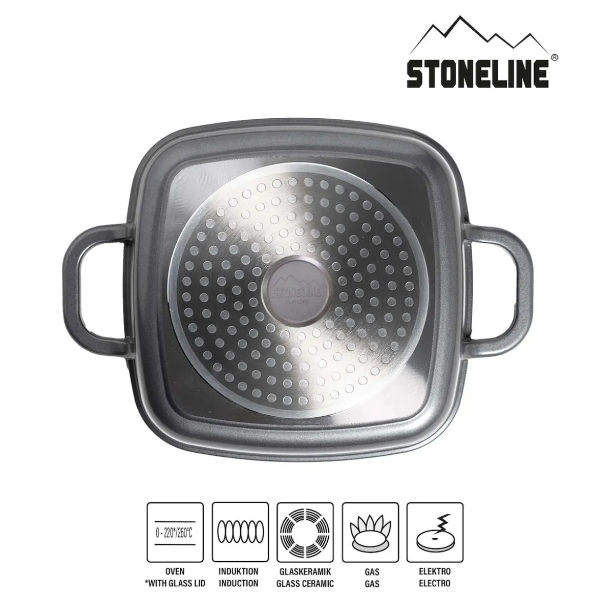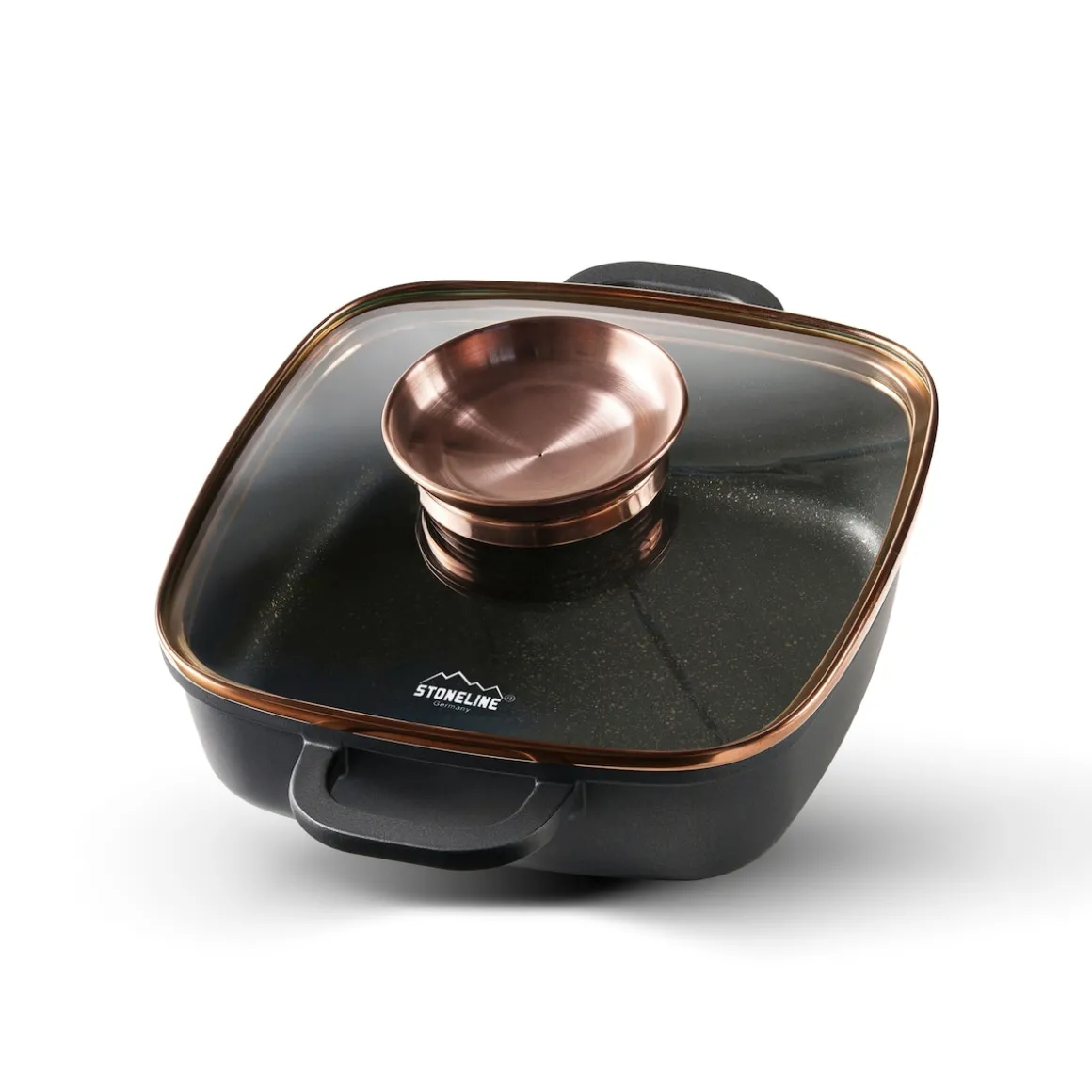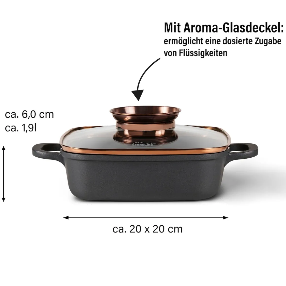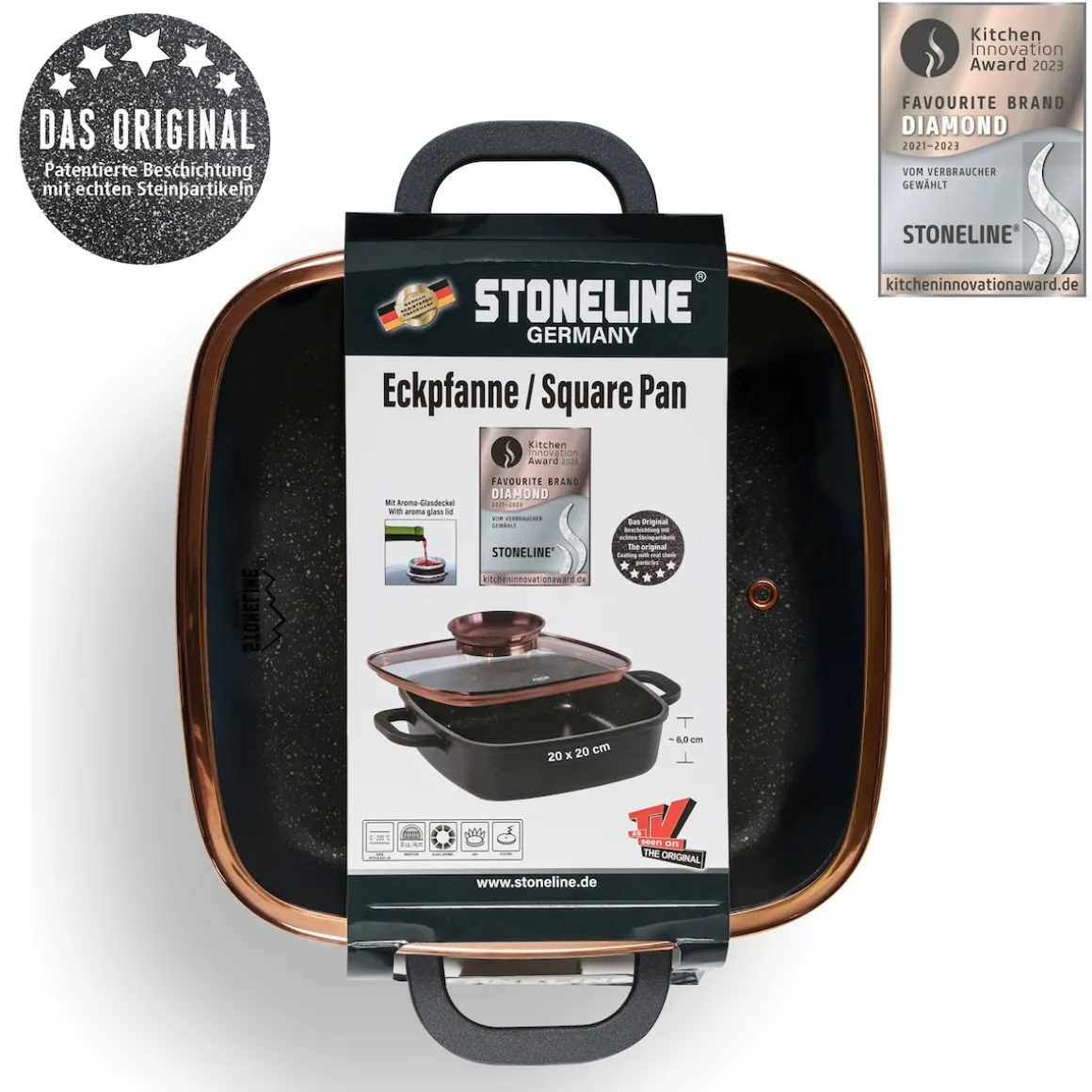 STONELINE – Das Original!Gesund fettfrei kochen und braten!Eleganz trifft auf Leidenschaft. Diese Eckpfanne in der anmutigen und edlen Farbe Roségold in Kombination mit stilvollem Matt-schwarz bringt ein zeitloses Flair in Ihre Küche.Diese Eckpfanne lässt sich multifunktional einsetzen: Egal, ob Sie Fleisch anbraten, ein Filet garen, einen Braten oder einen Auflauf im Backofen schmoren möchten, mit dieser Pfanne gelingt Ihnen einfach alles. Die Bratpfanne ist eckig, damit sich eine zusätzliche Bratfläche von mehr als 25 % gegenüber einer runden Pfanne ergibt. Diese eckige Pfanne ist ein Muss für jeden Küchenhaushalt.Der einzigartige Aroma-Glasdeckel ermöglicht eine dosierte Zugabe von Flüssigkeiten wie z. B. Wein, flüssige Gewürze oder andere Essenzen über den Deckelknauf. So erhalten Ihre verfeinerten Speisen den unverkennbaren Geschmack der zugegebenen Aromen. Die Eckpfanne ist bis 220 °C backofengeeignet und mit der bewährten STONELINE Antihaftbeschichtung ausgestattet.Zum Herausholen aus dem Ofen ziehen Sie einfach die mitgelieferten Thermo-Schutzhüllen über die Griffe. Hierbei spielt es keine Rolle, ob Sie auf Glaskeramik, Induktion, Elektro oder Gas kochen. In der STONELINE Eckpfanne mit der original STONELINE-Beschichtung bleiben keine hartnäckigen Reste haften und die einfache Handwäsche spart Ihnen Zeit und Mühe.1 Eckpfanne Induktion, ca. 20 x 20 cm, Höhe: ca. 6,0 cm, ca. 1,9 l, Induktionsboden: ø ca. 14 cm1 Aromaglasdeckel, ca. 20 x 20 cm2 ThermogriffschützerIn der Farbe: RoségoldDie wichtigsten Vorteile des STONELINE Kochgeschirrs auf einen Blick: Weltweit einzige Antihaftbeschichtung mit echten Steinpartikeln Kratzfeste STONELINE-Antihaftbeschichtung Optimales Bratergebnis und kross gebratenes Fleisch Bester Geschmack Vitaminschonend kochen und braten ohne Fett und Öl Kein Anbrennen und kein Ankleben Super leicht zu reinigen Für alle Herdarten geeignet, auch Induktion Extra starker, verzugsfreier Boden Bodenstärke 5,3 mm Backofengeeignet bis 220 °C (ohne Deckel, ohne Thermogriffschützer) / 180 °C (mit Deckel, ohne Thermogriffschützer) Material: AluminiumgussReinigungs- und Pflegetipps:Vor dem ersten Gebrauch empfehlen wir, Ihr Koch- oder Backgeschirr mit etwas Wasser und einem milden Spülmittel gründlich auszuwaschen. Verteilen Sie anschließend mit einem Papierküchentuch einige Tropfen Speiseöl auf der Beschichtung. Bei der weiteren Nutzung können Sie auf den Einsatz von Fett oder Öl verzichten! Dank dem Easy-Clean-Effekt wird die Reinigung per Hand empfohlen. Einfach mit heißem Wasser, Handspülmittel und einem weichen Schwamm auswischen.