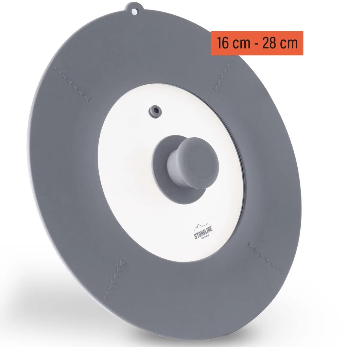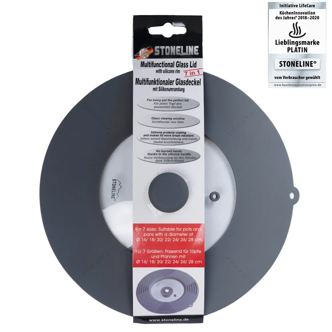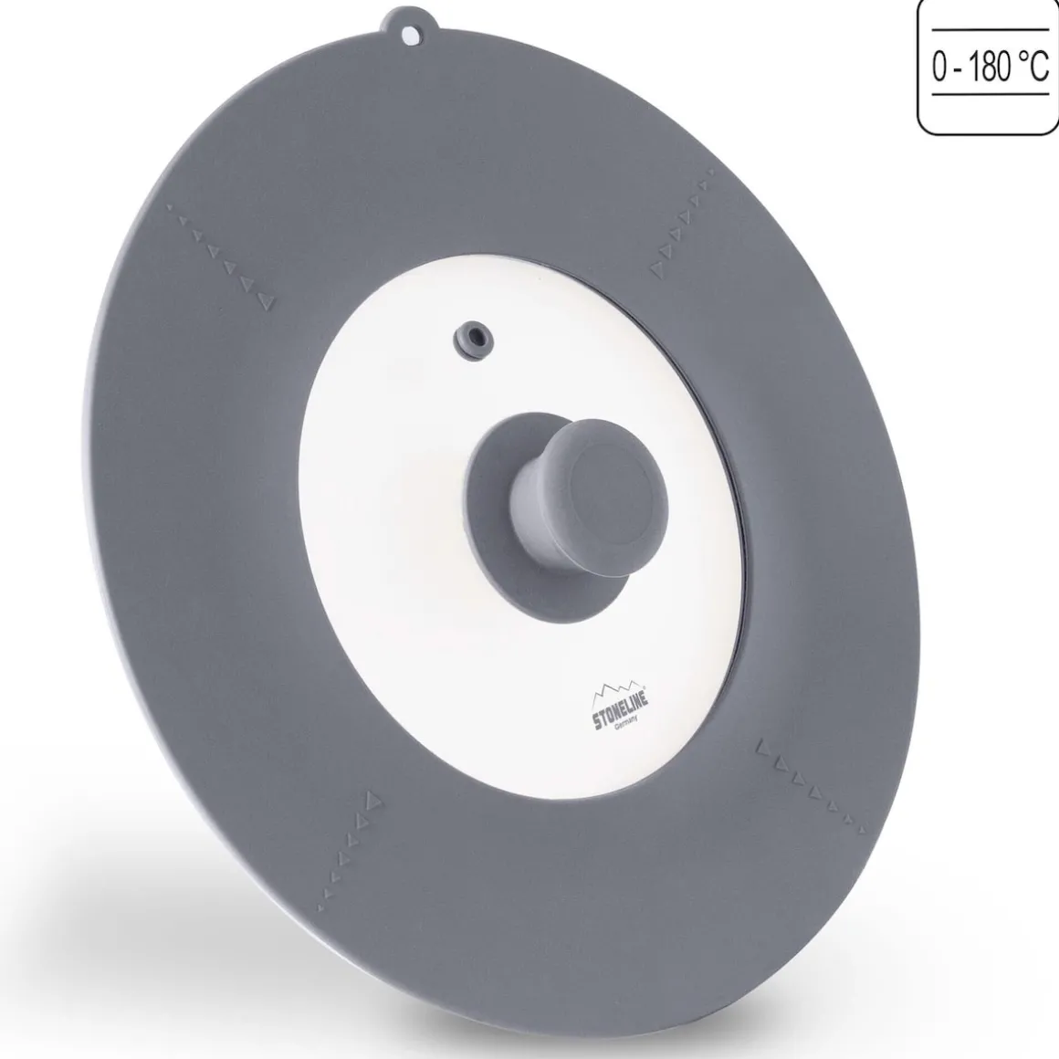 STONELINE – Das Original! Sie kennen wahrscheinlich das Problem, eine komplette Schublade voll mit unzähligen Glasdeckeln zu haben und dennoch finden Sie den passenden Deckel für Ihre Pfanne oder Ihren Topf nicht. Nun ist Schluss mit dem „Deckel-Chaos“ – dank des Universalglasdeckels von STONELINE! Der Universalglasdeckel von STONELINE mit Silikonrand passt auf sieben verschiedene Pfannen- und Topfgrößen! Der Silikonrand schont die Oberfläche des Kochgeschirrs und macht den Glasdeckel bruchsicherer. 1 Glasdeckel mit Silikonrand für die Größen ø 16 / 18 / 20 / 22 / 24 / 26 / 28 cm Sichtfenster aus Glas Keine Verbrennung der Hände dank Silikon-Knauf Mit Dampfauslass Hitzebeständig bis 180 °C Material: Sichtfenster aus bruchstabilisertem Glas, Silikonrand Einfache Reinigung: mit heißem Wasser ausspülen, trocknen, fertig (spülmaschinengeeignet)