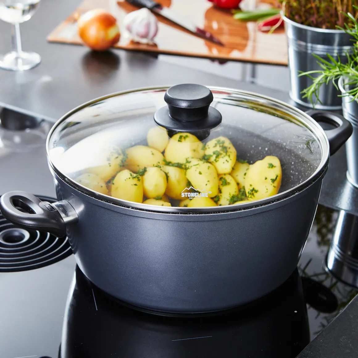 STONELINE – Das Original!Gesund fettfrei kochen und braten!Mit einem Fassungsvermögen von knapp 7 Litern und einer Höhe von ca. 13,5 cm eignet sich dieser XXL Topf mit Deckel ideal für die Zubereitung von großen Mengen.Dank der speziellen STONELINE-Antihaftbeschichtung lassen sich Ihre Speisen – je nach Wunsch – mit oder ohne Bratfett und Öl zubereiten und ganz ohne Ankleben aus dem Kochgeschirr lösen.Hierbei spielt es keine Rolle, ob Sie auf Glaskeramik, Induktion, Elektro oder Gas kochen.In dem Bratentopf mit der original STONELINE-Beschichtung bleiben keine hartnäckigen Reste haften und die einfache Handwäsche spart Ihnen Zeit und Mühe.1 Kochtopf, ø ca. 28 cm, Höhe: ca. 13,5 cm, ca. 6,9 l1 Glasdeckel, ø ca. 28 cmDie wichtigsten Vorteile des STONELINE Kochgeschirrs auf einen Blick:Weltweit einzige Antihaftbeschichtung mit echten SteinpartikelnKratzfeste STONELINE-AntihaftbeschichtungVitaminschonend kochen und braten ohne Fett und ÖlOptimales Bratergebnis und kross gebratenes FleischAuch für Vegetarier geeignet: Gemüse bleibt knackig und saftigKein Anbrennen und kein AnklebenSuper leicht zu reinigenExtra starker, Verzug freier BodenBodenstärke: 5,0 mmFür alle Herdarten geeignet, auch InduktionBackofengeeignet bis 180 °CMaterial: AluminiumgussReinigungs- und Pflegetipps:Vor dem ersten Gebrauch empfehlen wir, Ihr Koch- oder Backgeschirr mit etwas Wasser und einem milden Spülmittel gründlich auszuwaschen. Verteilen Sie anschließend mit einem Papierküchentuch einige Tropfen Speiseöl auf der Beschichtung.Bei der weiteren Nutzung können Sie auf den Einsatz von Fett oder Öl verzichten!Dank dem Easy-Clean-Effekt wird die Reinigung per Hand empfohlen. Einfach mit heißem Wasser, Handspülmittel und einem weichen Schwamm auswischen.