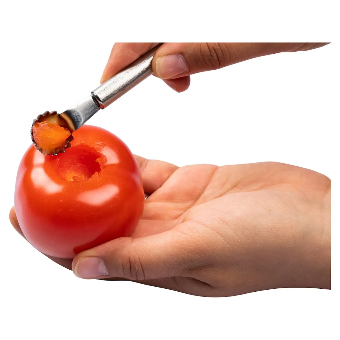 Mit diesem cleveren Küchenhelfer sparen Sie Zeit: Dank der scharfen Zacken hebeln Sie den Tomatenstrunk schnell und leicht heraus. Auch zum Aushöhlen von Gemüse oder Obst geeignet.