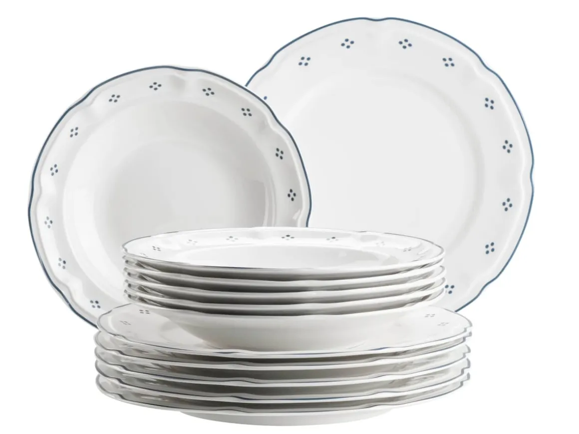 Mit dem Tafelservice „Lova“ von MÄSER holen Sie sich Landhaus-Charme und Kaffeehaus-Romantik direkt auf den Tisch. Das 12-teilige Set besteht aus 6 Speisetellern (26 cm) und 6 Suppentellern (22 cm), gefertigt aus hochwertigem Porzellan.