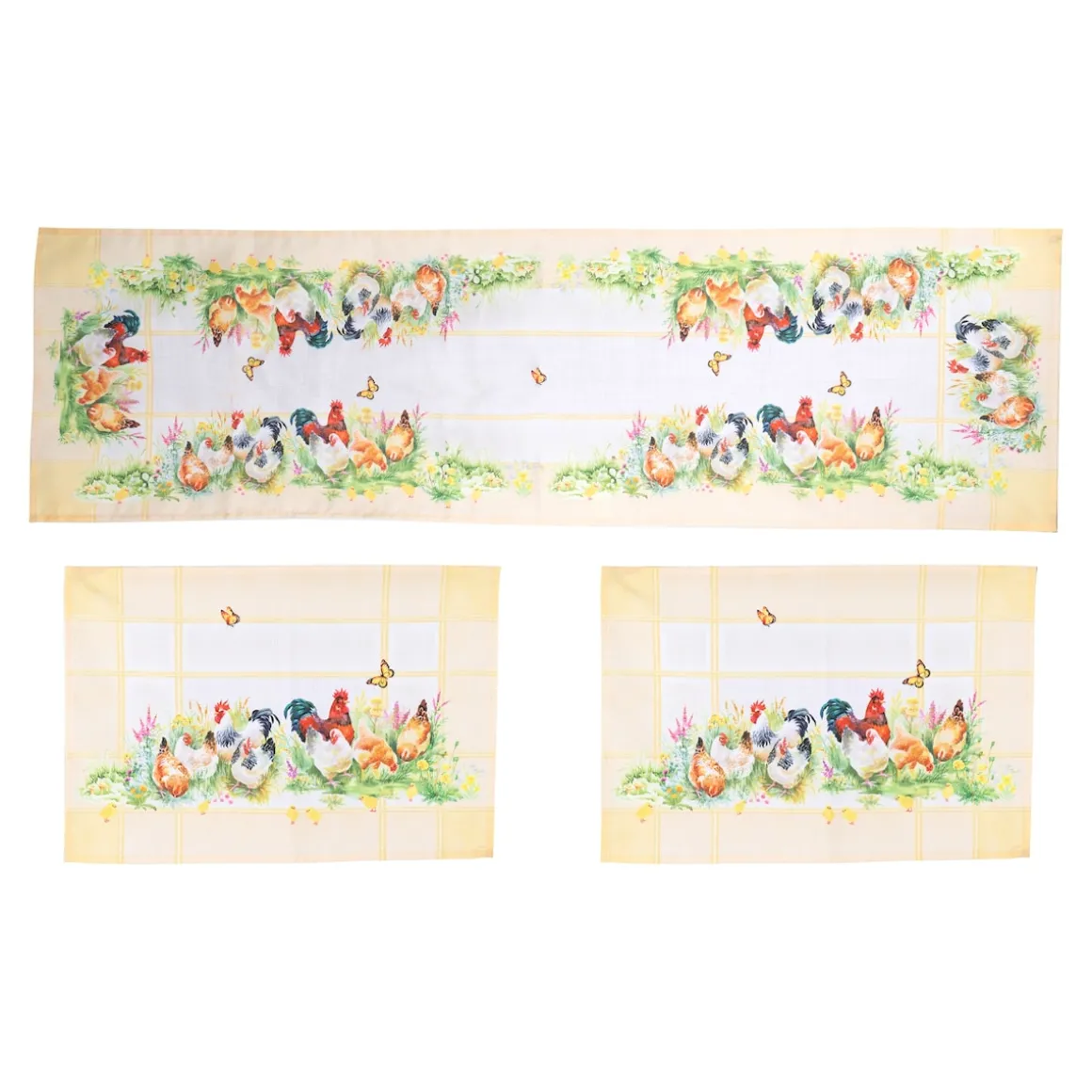 Gleich mit dem ersten Morgenlicht begrüßt Sie zu Tisch oder am Fenster eine fröhliche Hühnerschar, die es sich schon zum gemeinsamen Mahl auf der Frühlingswiese gemütlich gemacht hat.