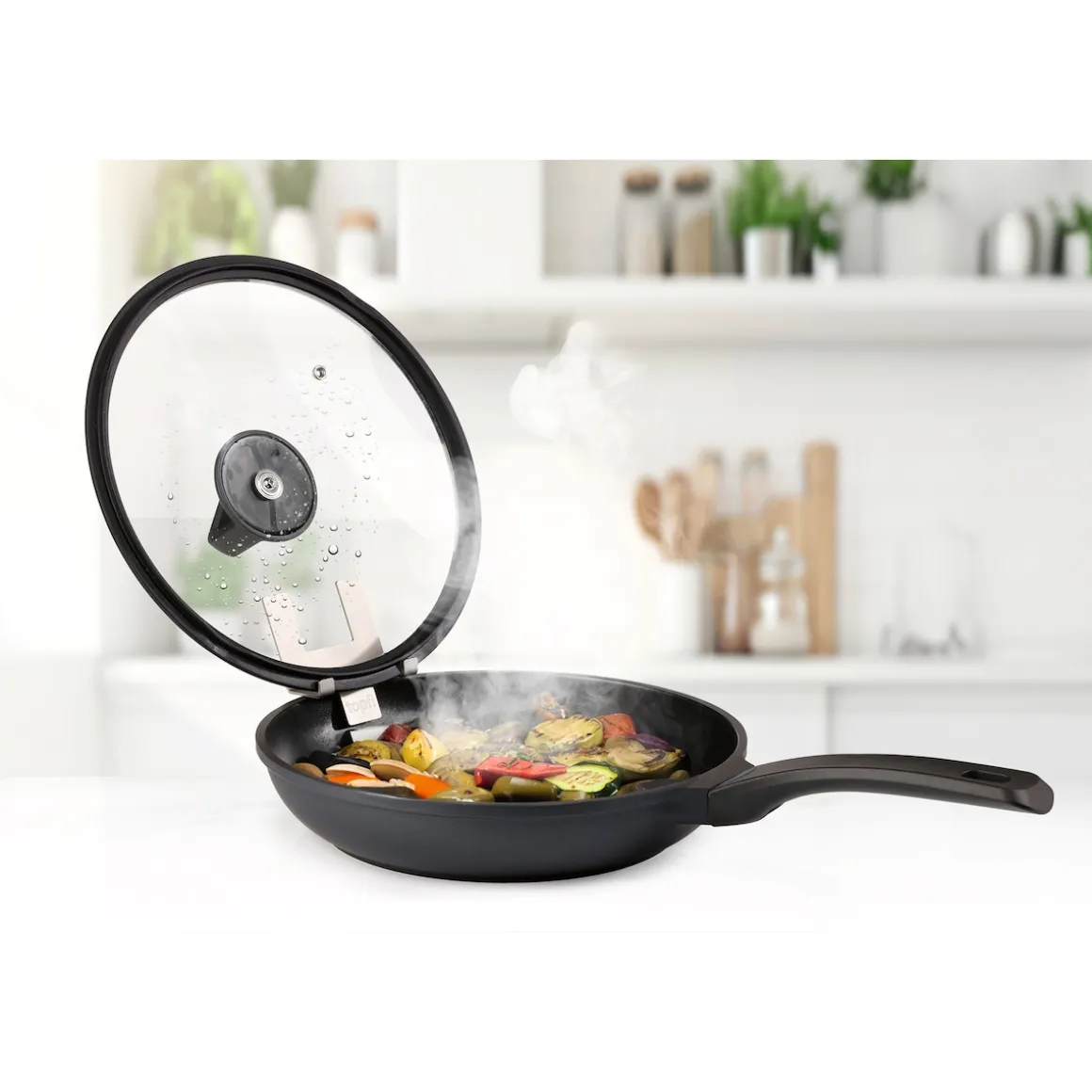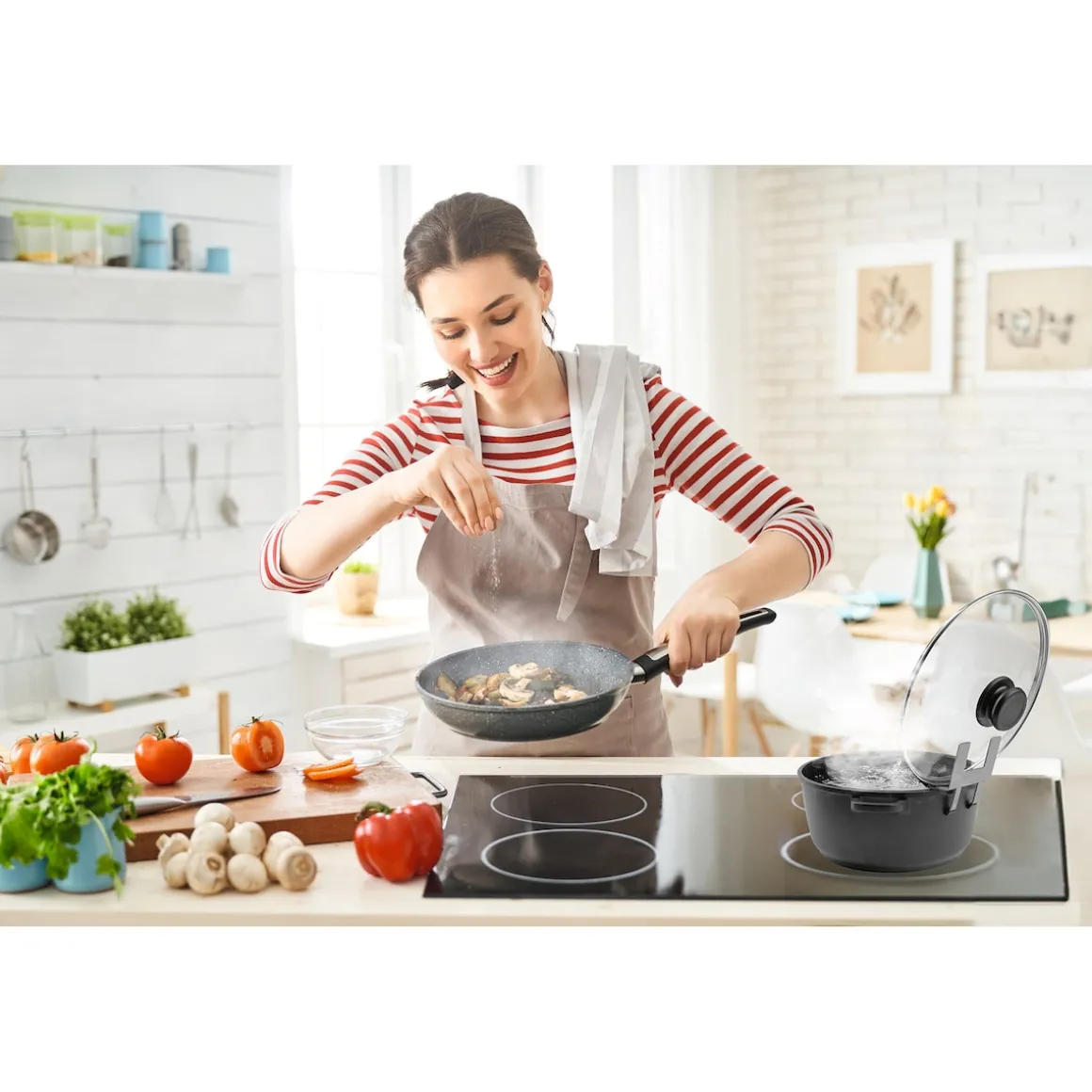 Die weichen, hitzebeständigen Silikonfüße sorgen für stabilen Halt und schützen Töpfe und Pfannen zuverlässig vor Kratzern. Der Halter ist passend für Deckel mit einem Durchmesser von 16 bis 30 cm, spülmaschinengeeignet und designt in Deutschland – für mehr Ordnung, Sauberkeit und Entspannung beim Kochen.