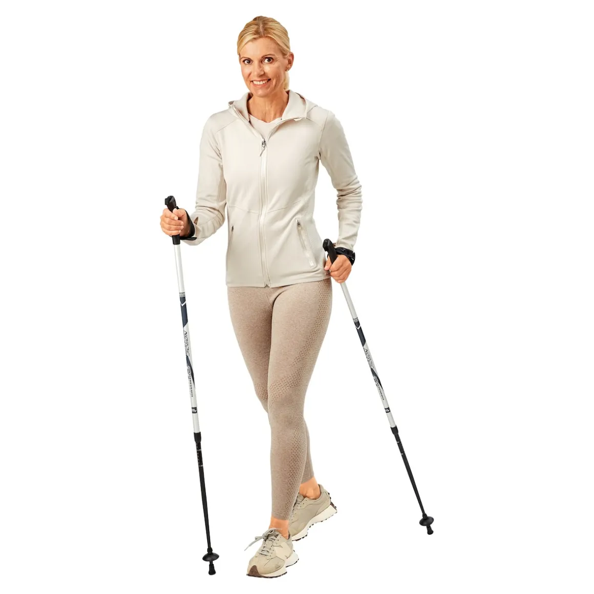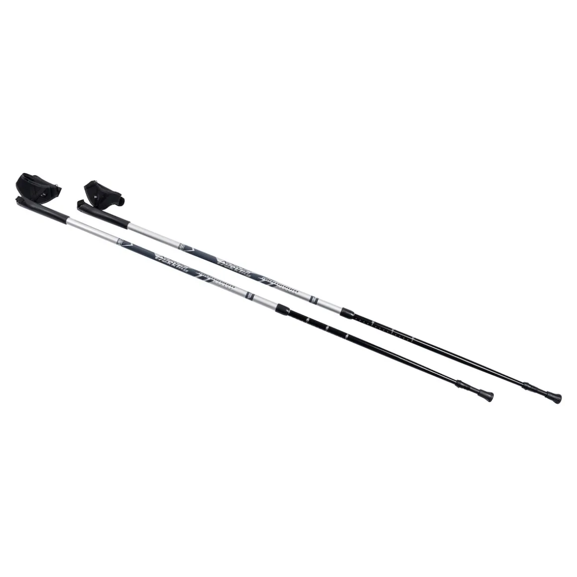 Die sorgen für einen schwungvollen, rhythmischen Gang. Mit ergonomisch geformten Kunststoffgriffen und längenverstellbaren Schlaufen. Die Stöcke sind stufenlos verstellbar von 84 bis 140 cm. Aus lackiertem Aluminium.