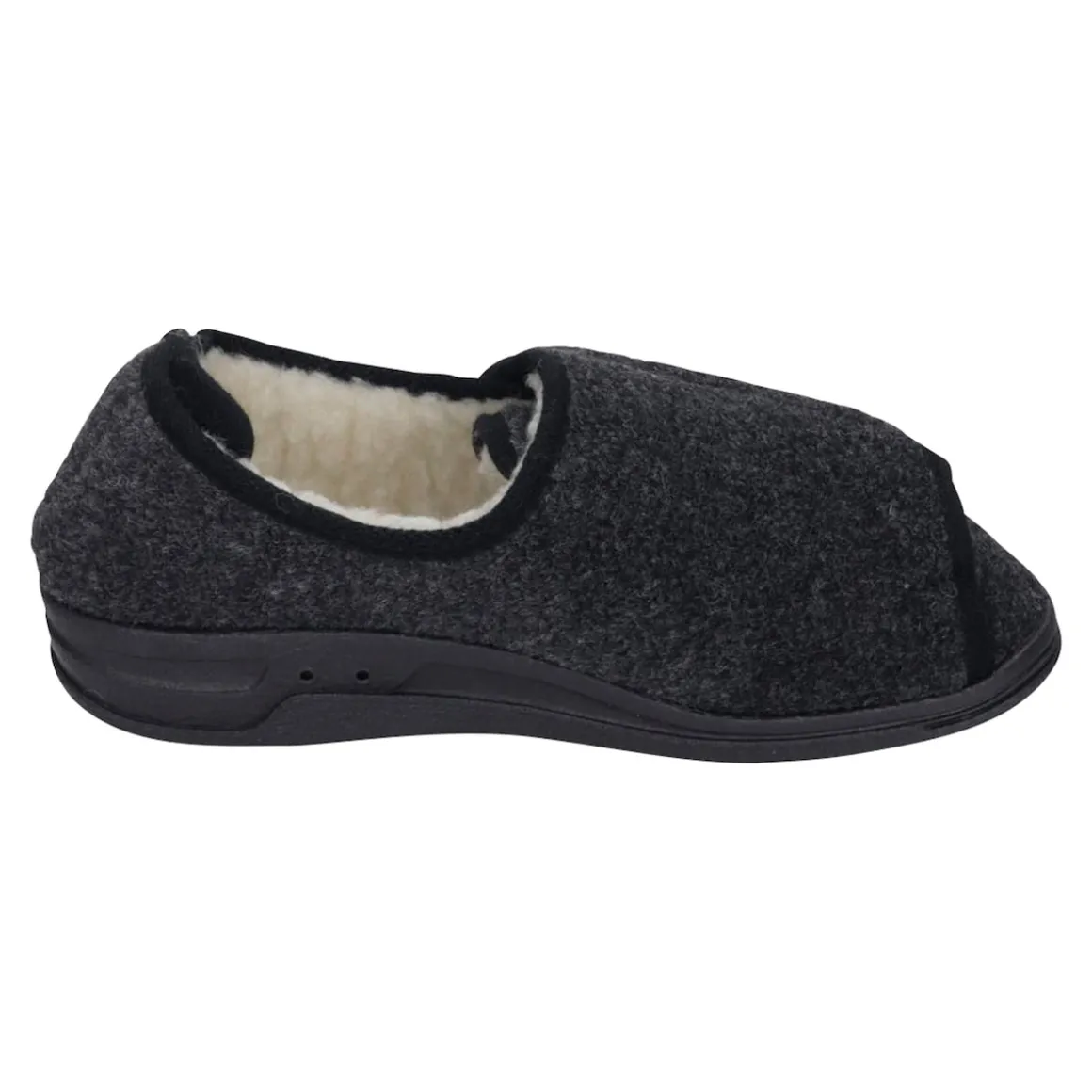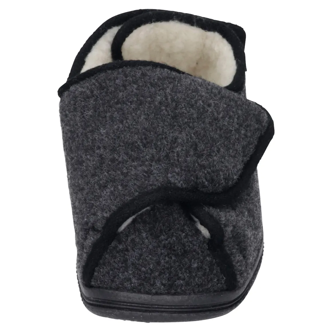 Natürlich warm: Obermaterial Filz, innen kuschelweiches Schurwoll-Futter. Komplett zu öffnen, mit Klettverschlüssen vorne und hinten individuell einstellbar. Rutschhemmende Laufsohle.