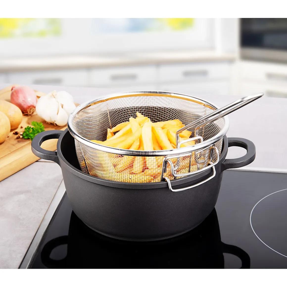 Frittieren Sie knusprige Köstlichkeiten ganz einfach im Topf! Dank des praktischen Frittierkorbs mit Henkel können Sie Pommes & Co. prima aus dem Fett holen und sie gut transportieren. Hitzebeständig bis +300 °C.