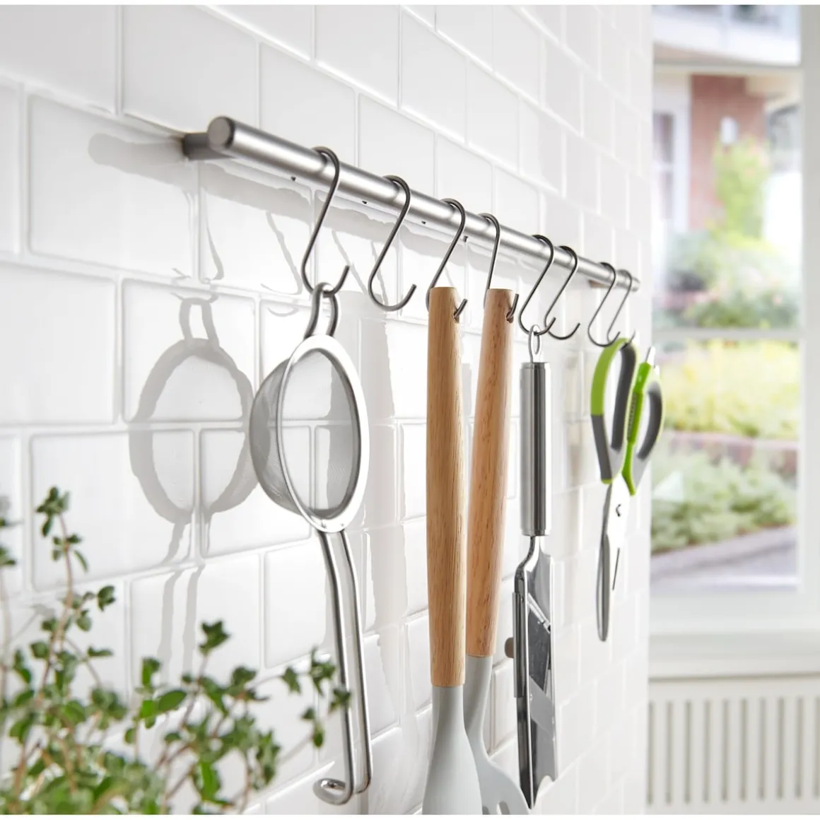 Diese stabilen S-Haken helfen dabei, Ihre Küchenhelfer übersichtlich und stets griffbereit aufzubewahren. Schöner Nebeneffekt: Die Arbeitsfläche bleibt frei.