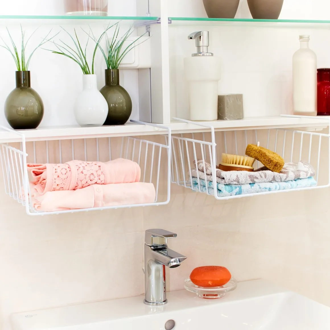 Ob Schrank oder Regal: Das nützliche Unterbauregal findet als zusätzliche Ablage überall seinen Platz. Einfach mit den Halterungen auf den Regalboden schieben – fertig! Schon haben Sie in Bad oder Küche neue Staumöglichkeiten für Hand- und Geschirrtücher u. v. m.