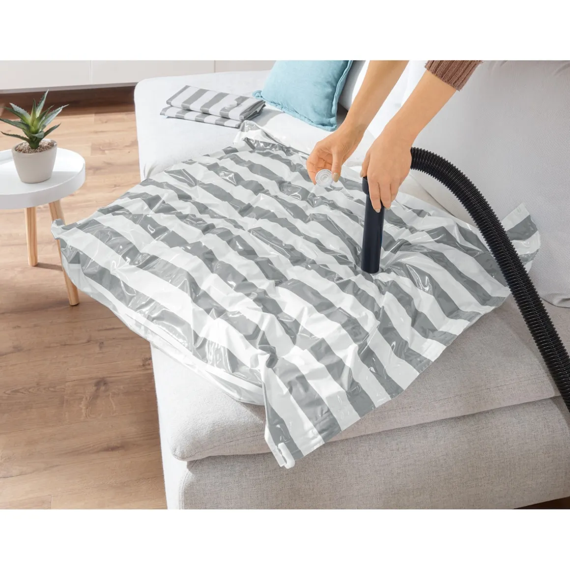 Stellen Sie sich vor: Sie packen Ihre Winterjacken, Decken oder Kissen in diesen Beutel, saugen die Luft mit Ihrem Staubsauger heraus und voilà – plötzlich sind sie so platzsparend, dass Sie jede Menge Platz in Ihrem Kleiderschrank oder unter dem Bett haben. Und nicht nur das: Die robusten Beutel schützen Ihre liebsten Textilien vor Feuchtigkeit, Staub und Ungeziefer.