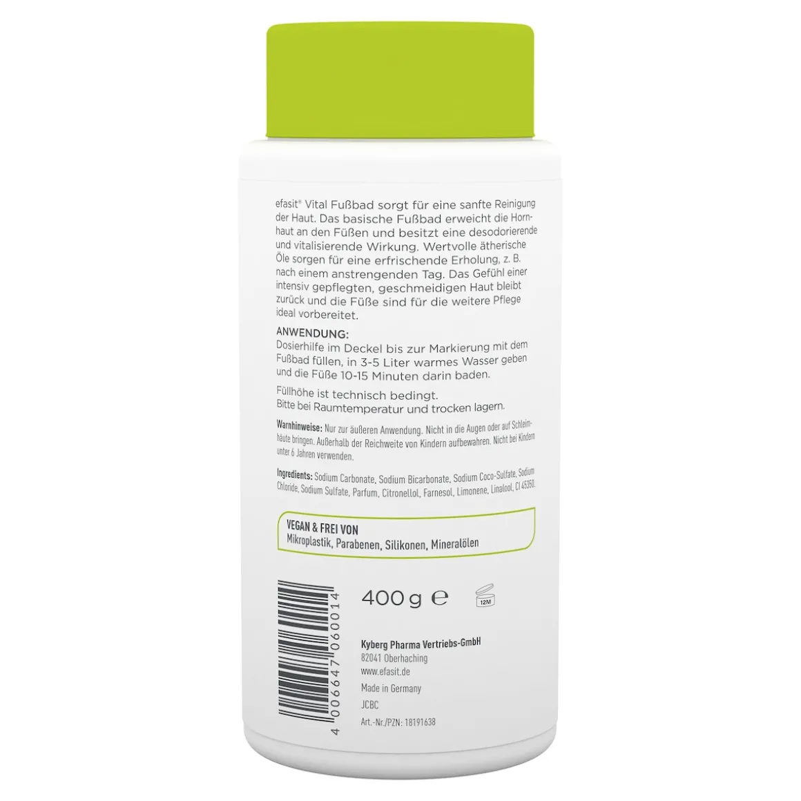 Das Vital Fußbad sorgt für eine sanfte Reinigung der Haut. Das Fußbad erweicht die Hornhaut an den Füßen und besitzt eine desodorierende und vitalisierende Wirkung. Das Gefühl einer intensiv gepflegten, geschmeidigen Haut beibt zurück und die Füße sind für die weitere Pflege ideal vorbereitet. Qualitätsprodukt aus Deutschland. Anwendung: Eine Innenkappe Fußbad in 3 – 5 Liter warmes Wasser geben und die Füße 10 – 15 Minuten darin baden.