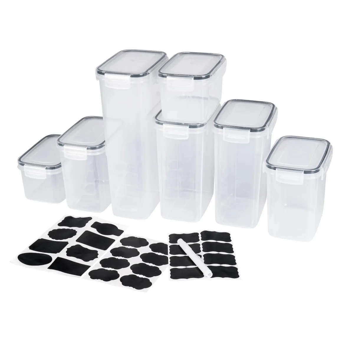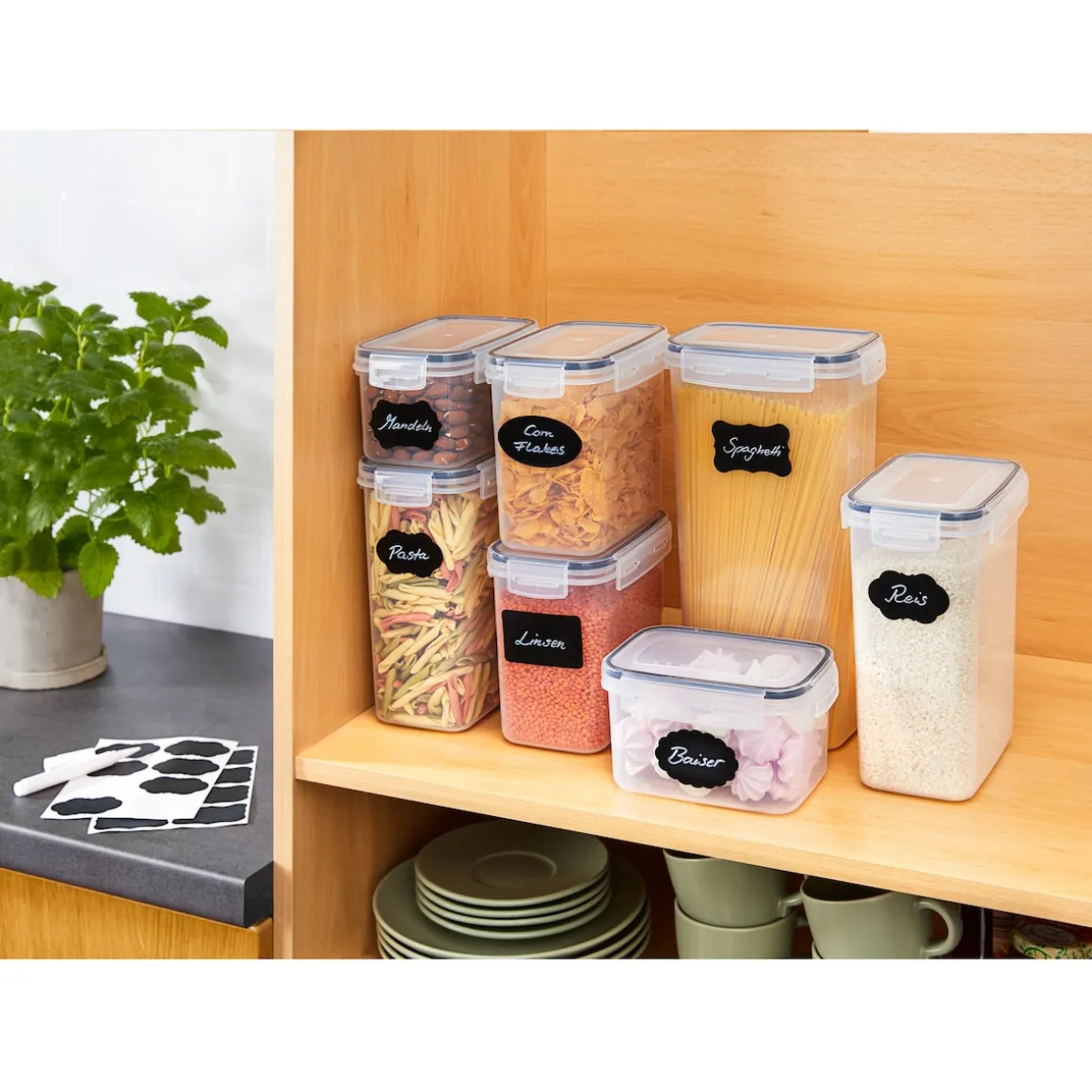 Mit unserem 7-teiligen Vorratsdosen-Set bewahren Sie Nudeln, Müsli und andere Lebensmittel übersichtlich und platzsparend auf. Dank des sicheren Verschlusses mit Silikonring bleiben Ihre Lebensmittel lange frisch und sind auch ideal für unterwegs geeignet.