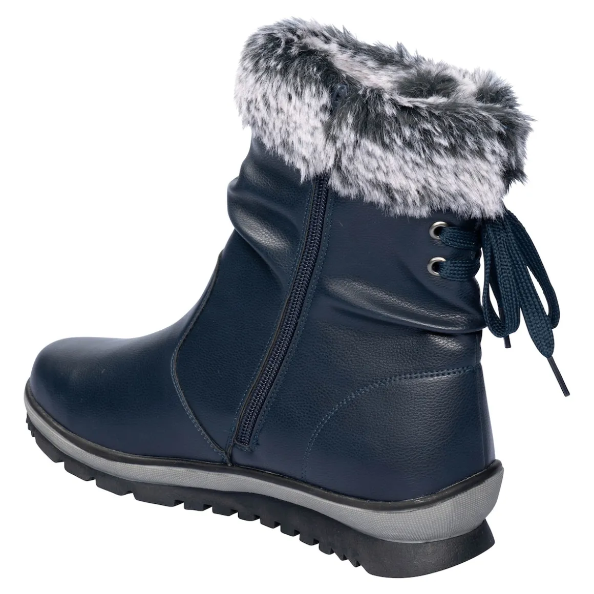Der attraktive Winterstiefel in Leder-Optik mit Reißverschluss überzeugt an kalten Tagen mit warmem Futter, üppigem Kunstfellrand und weicher Decksohle. Der Reißverschluss auf der Innenseite ermöglicht einen mühelosen Ein- und Ausstieg. Die Schnürung am hinteren Schaft sorgt für den perfekten Sitz, auch bei stärkeren Waden. Mit zweifarbiger Gummi-Profil-Laufsohle.