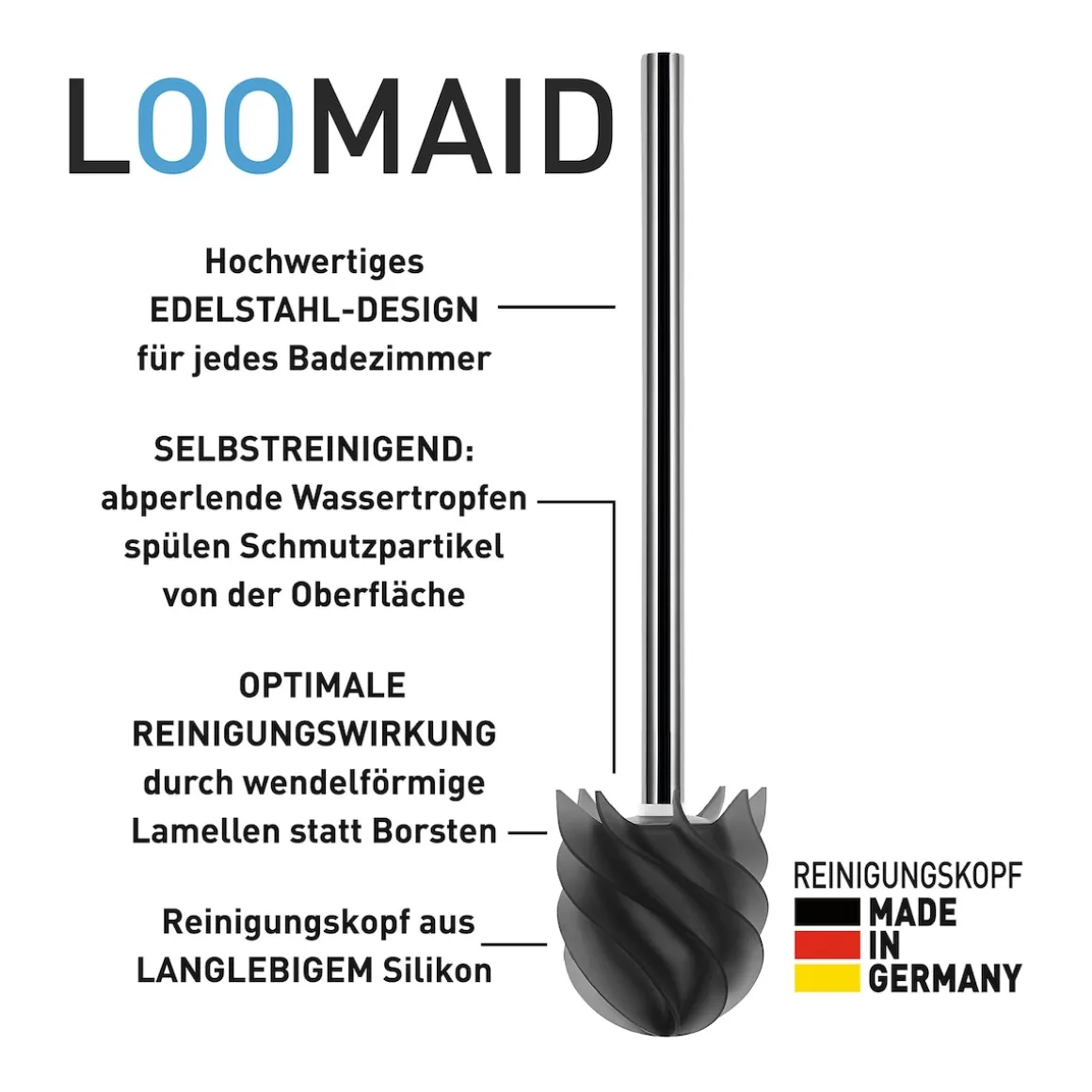 Strenggenommen ist die LOOMAID keine WC-Bürste, denn ihr Reinigungskopf besteht anstelle von Borsten aus Silikon, das einige Vorteile mitbringt. So ist das Material besonders hygienisch, da Schmutzpartikel durch den Lotoseffekt nicht auf der Oberfläche anhaften, sondern beim Spülen einfach abgewaschen werden. Das gilt auch für Wasser, das beim Reinigen von selbst von der LOOMAID abperlt und nicht – wie bei klassischen WC-Bürsten – zu einem großen Teil im Bürstenhalter landet. Dadurch reduziert sich der Reinigungsaufwand der Bürste und des Bürstenhalters erheblich. Übrigens: Für die Pflege der Silikon-Bürste reicht die gelegentliche Nutzung eines herkömmlichen WC-Reinigers während des Reinigungsvorgangs aus.