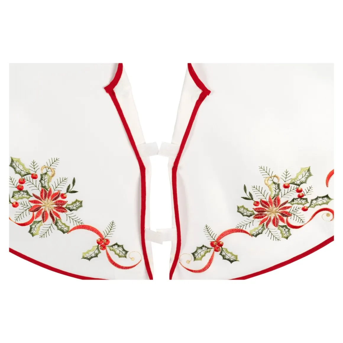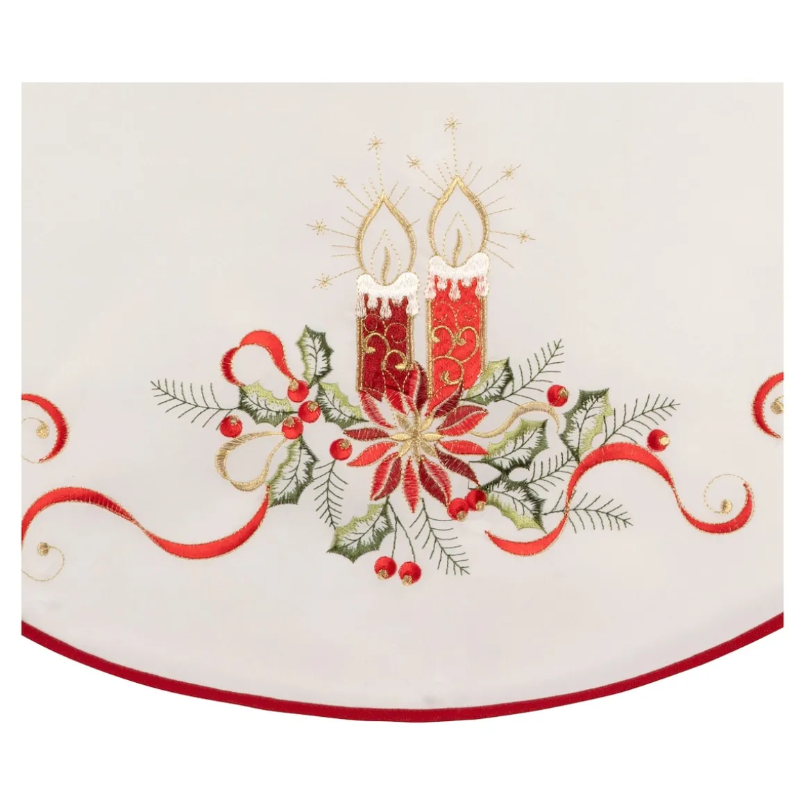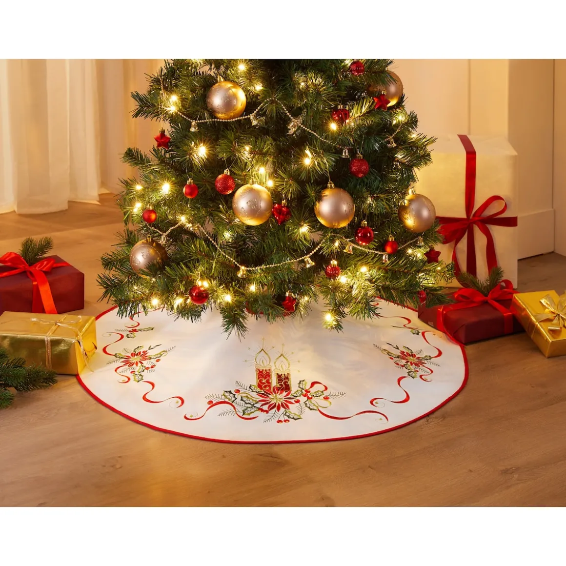 Verschönern Sie Ihren Weihnachtsbaum mit einer eleganten, bestickten Baumdecke. Die detailreiche Kerzenstickerei und das eingefasste rote Band verleihen Ihrem Baum festlichen Glanz. Der praktische Klettverschluss sorgt für leichtes Auf- und Abziehen.