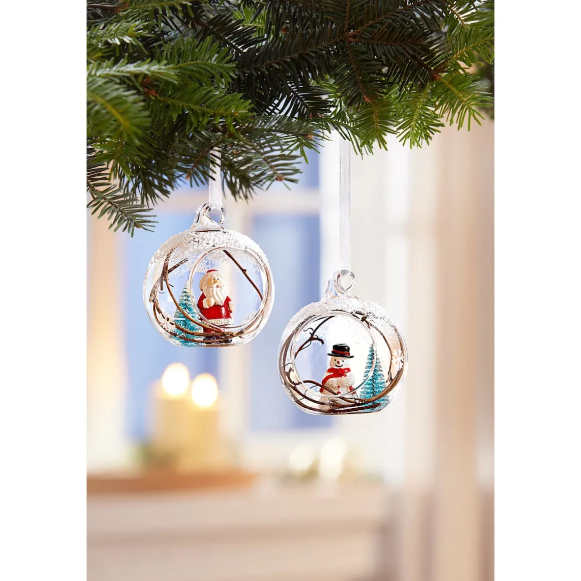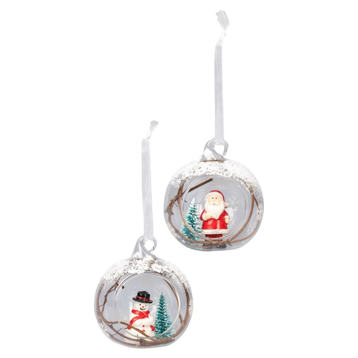 Weihnachtsschmuck in bezaubernder 3D-Optik: In diesen winterlichen Glaskugeln, liebevoll mit Kunstschnee und Zweigen verziert, wohnen Santa Claus und Schneemann „Frosti“. Beiden sieht man die Vorfreude auf das große Fest deutlich an!