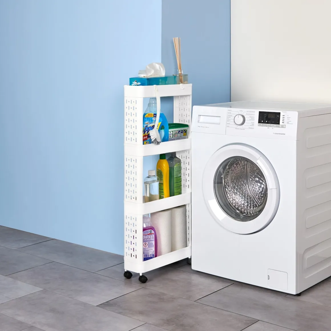 Nicht nur im Bad sorgt dieser Rollwagen für mehr Stauraum – auch in Küche, Abstellraum & Co. macht er sich stets nützlich. Auf seinen Rollen folgt er Ihnen überall hin, wo Ordnung angesagt ist! Passt sogar in schmale Nischen. In 2 Größen erhältlich.