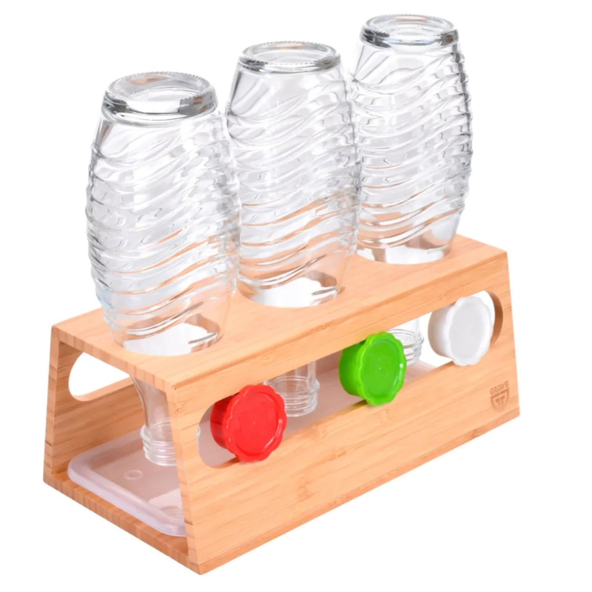 Stylischer Flaschenhalter in trapezförmigen Design zur Trockung und Aufbewahrung von drei Sodastream-Flaschen und von Verschlussdeckeln.