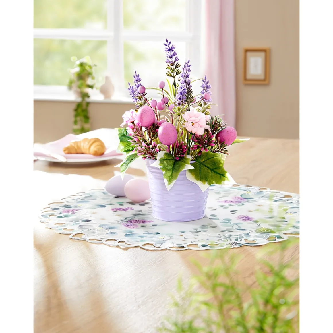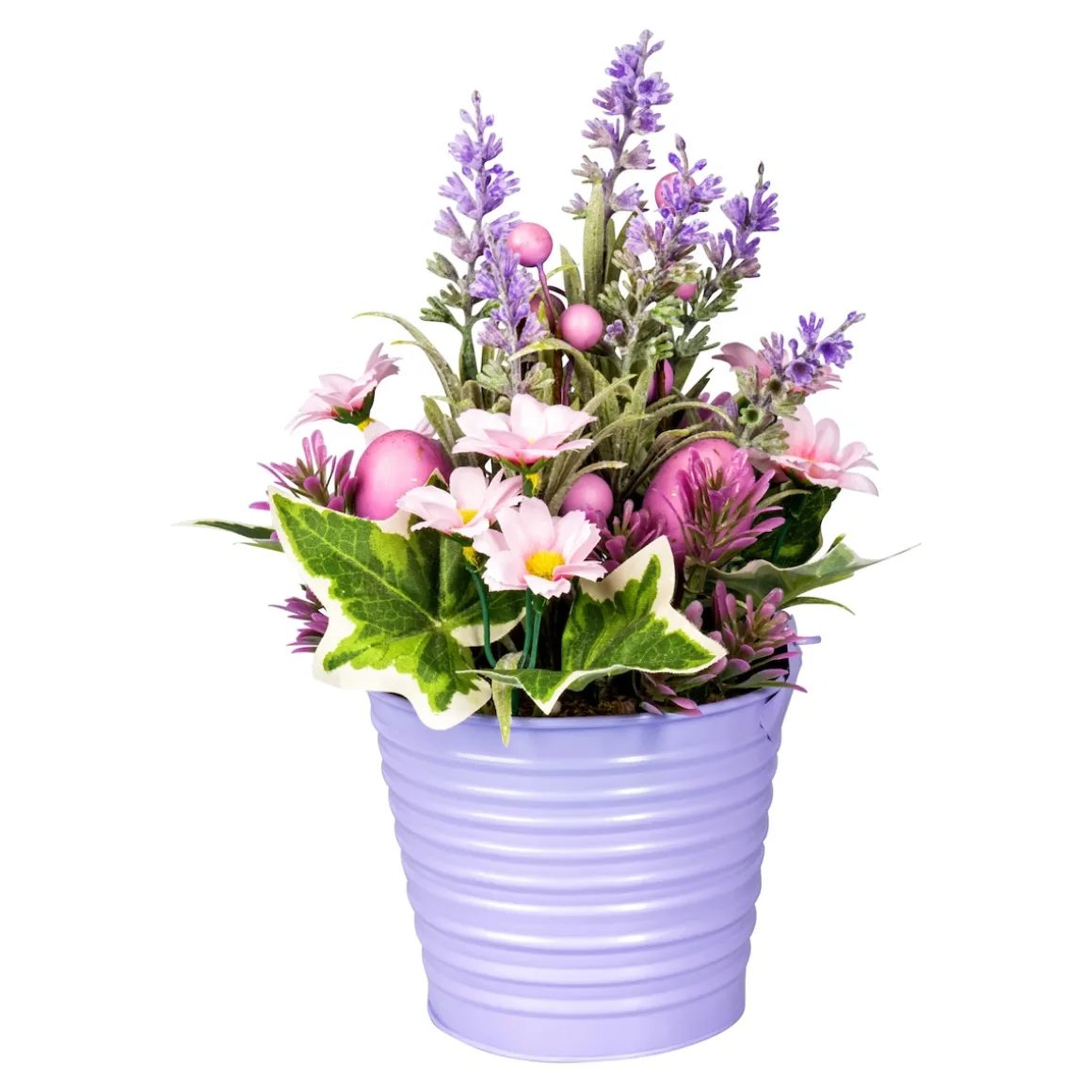 Dieses anmutende Ostergesteck versprüht den Charme von Lavendelfeldern der Provence. Blumen und Ostereier sind harmonisch im Metalltopf arrangiert.