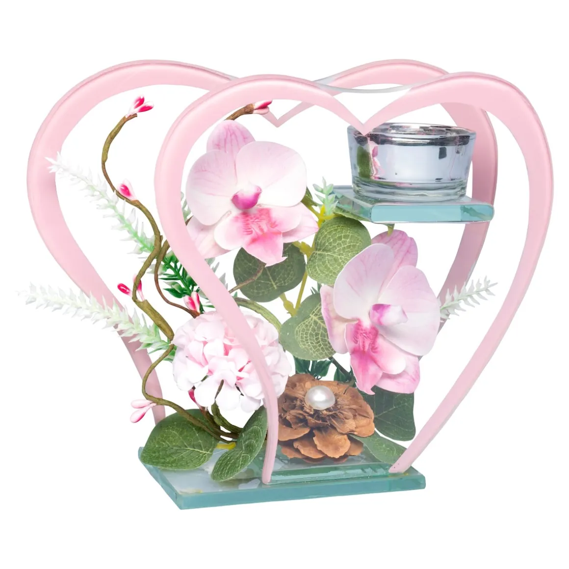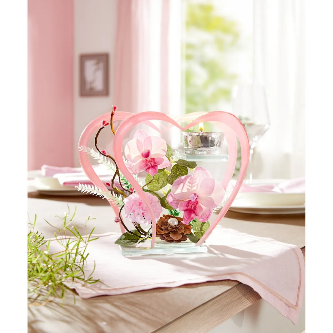 Herz an Herz! Jetzt ist genau die richtige Zeit, Frühlingsgefühle einziehen zu lassen: Kunstvoll gearbeitete Orchideen, Hortensien und Kirschblütenknospen vereinen sich zu einem dekorativen Arrangement und wirken im Kerzenschein eines LED-Teelichts (gleich mitbestellen) besonders stimmungsvoll.