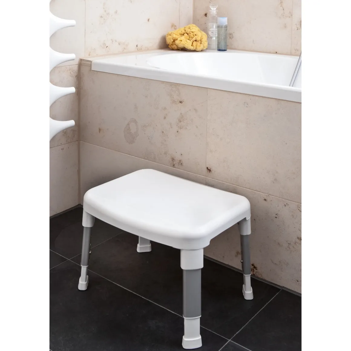 Sicher in die Wanne – sicher wieder heraus. Die ganze Familie profitiert von der praktischen Einstiegshilfe. Gummierte Füße sichern einen rutschfesten Stand. Mit großer, kantenloser Trittfläche.