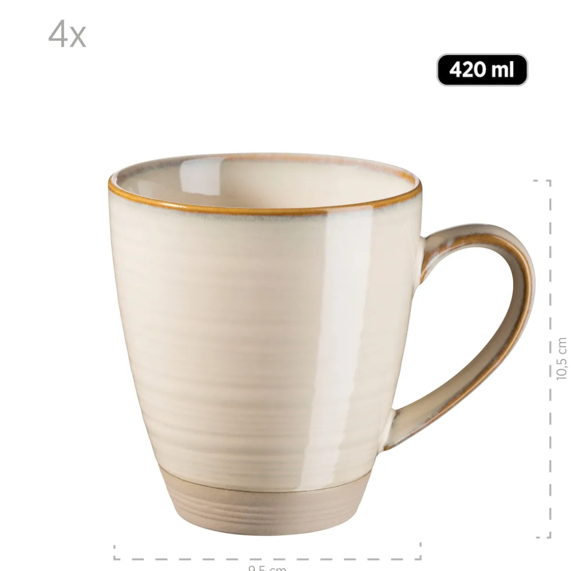 Dieses 12-teilige Frühstücksgeschirr Service aus hochwertigem Steinzeug besteht aus 4 Desserttellern à Ø 21 cm, 4 großen Müslischalen à Ø 15 cm (600 ml) und 4 großen Kaffeetassen à 420 ml