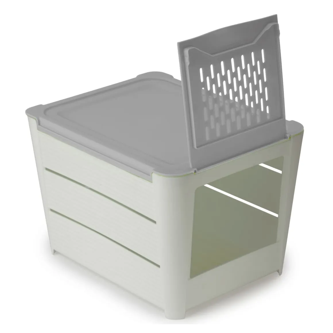 Die Box bietet Platz für etwa drei Kilogramm Obst oder Gemüse. Dieses lässt sich leicht über die Klappöffnung einfüllen und entnehmen. Dank ihres kompakten Designs passt sie gut in jeder Küche auf die Arbeitsplatte, lässt sich aber genauso im Keller oder Vorratsraum aufstellen. Da die Boxen stapelbar sind, können bei Bedarf mehrere problemlos übereinandergestellt werden. Das ist sinnvoll, um Obst- und Gemüsesorten, die sich nicht so gut vertragen (z. B. Äpfel und Kartoffeln), zu trennen oder einfach System in die Vorratshaltung zu bringen.