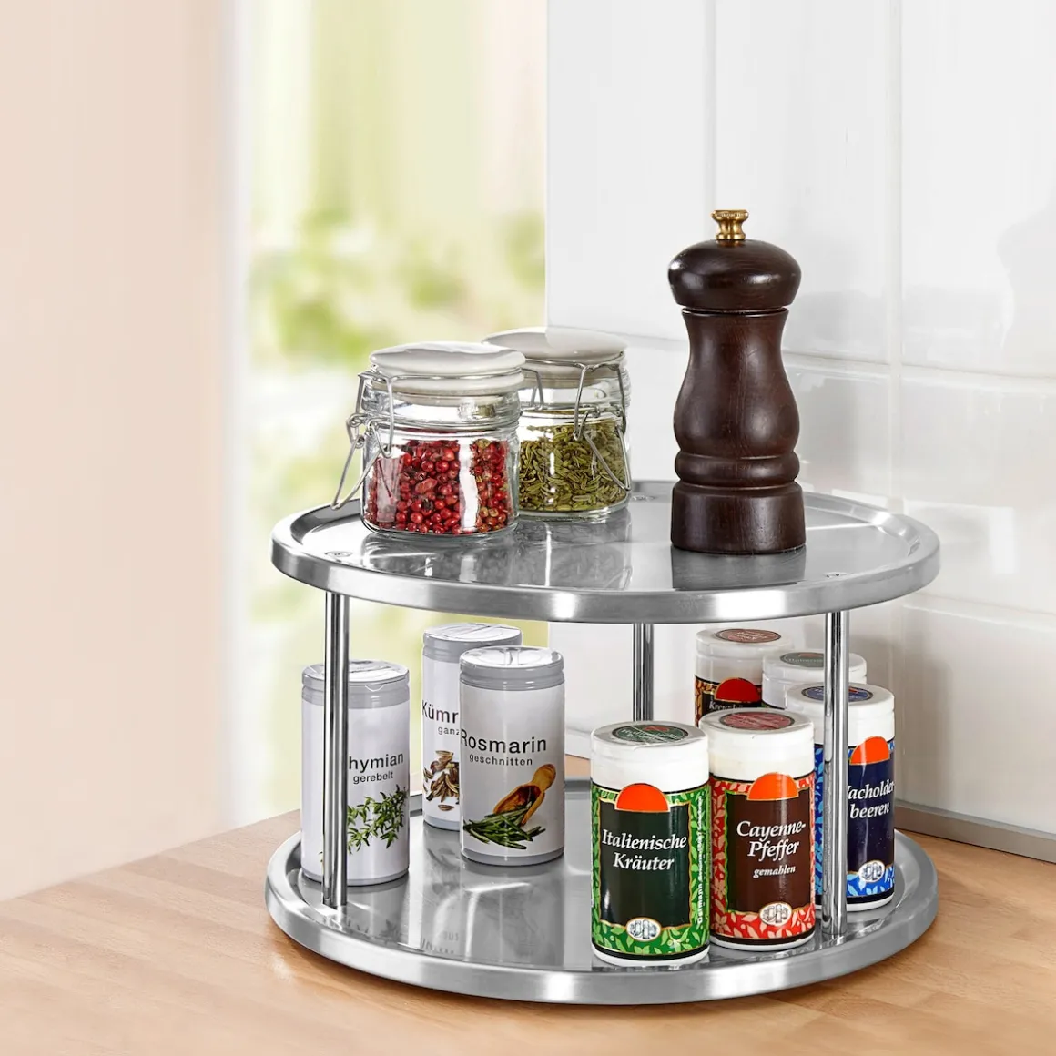 Mit seiner edlen Optik macht das Schrankrondell aber nicht um Schrank eine gute Figur, sondern bietet sich auch als dekorative Ordnungslösung für die Arbeitsplatte an. Besonders Hobbyköche lieben das Doppeldecker-Rondell, denn seine beiden Etagen lassen sich nutzen, um häufig verwendete Gewürze, Kräuter, Öle und Essige aufzubewahren. Langes Kramen im Gewürzregal gehört damit der Vergangenheit an, denn Salz, Safran oder das gute Walnussöl sind immer nur einen Dreh entfernt.