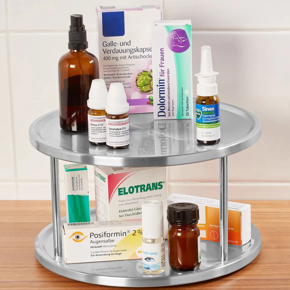 Übrigens: Das Schrankrondell lässt sich bei Bedarf auch als Servierteller auf der festlichen Tafel oder auf dem Büffet zweckentfremden. Dank seines schlicht-eleganten Designs fügt es sich überall harmonisch ein und kann seine drehbaren Vorzüge ausspielen. So eignet es sich ideal, um es mit kleinen Dips, Gebäck, herzhaften Snacks oder Süßigkeiten zu bestücken, von denen sich jeder Gast nach Belieben bedienen darf. Auch Medikamente, Brotaufstriche und sogar Kosmetikartikel lassen sich mithilfe des Rondells übersichtlich organisieren.