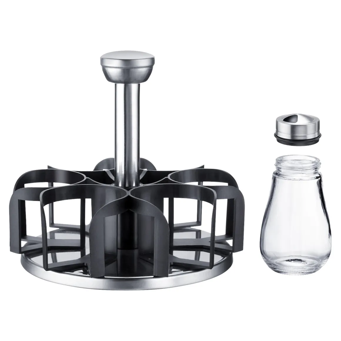 Ob beim Alltagskochen oder beim Dinner mit Freunden – Gewürze sind das i-Tüpfelchen Ihrer Gerichte. Doch wie oft suchen Sie nach Paprika, Curry oder Oregano? Dieses drehbare Rondell mit sechs eleganten Glasbehältern bringt Ordnung in Ihre Küche. Jeder Behälter fasst ca. 125 ml, lässt sich leicht befüllen und reinigen. Ideal für Ihr Zuhause – oder als praktisches Geschenk zur ersten Wohnung.