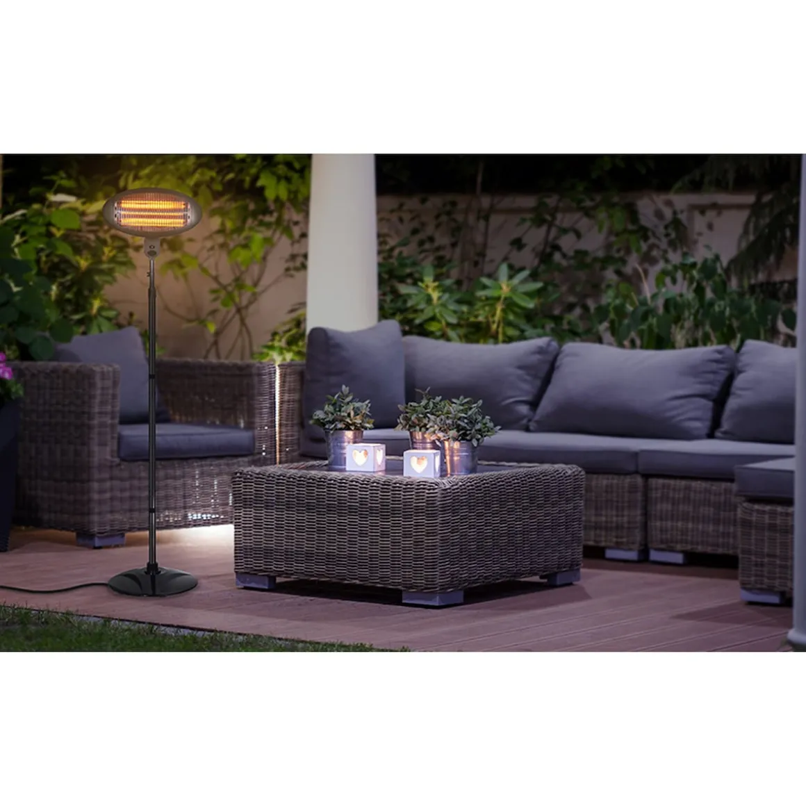 GUSTAV sorgt für eine angenehme Temperatur – ob auf der Terrasse, auf dem Balkon oder dem Gartensitzplatz. Verlängern Sie die schönen Stunden im Garten mit GUSTAV. Durch den «IP X4»-Schutz kann das Gerät auch in feuchter Umgebung in Betrieb genommen werden. GUSTAV dient sowohl als eleganter Licht- wie auch Wärmespender.
