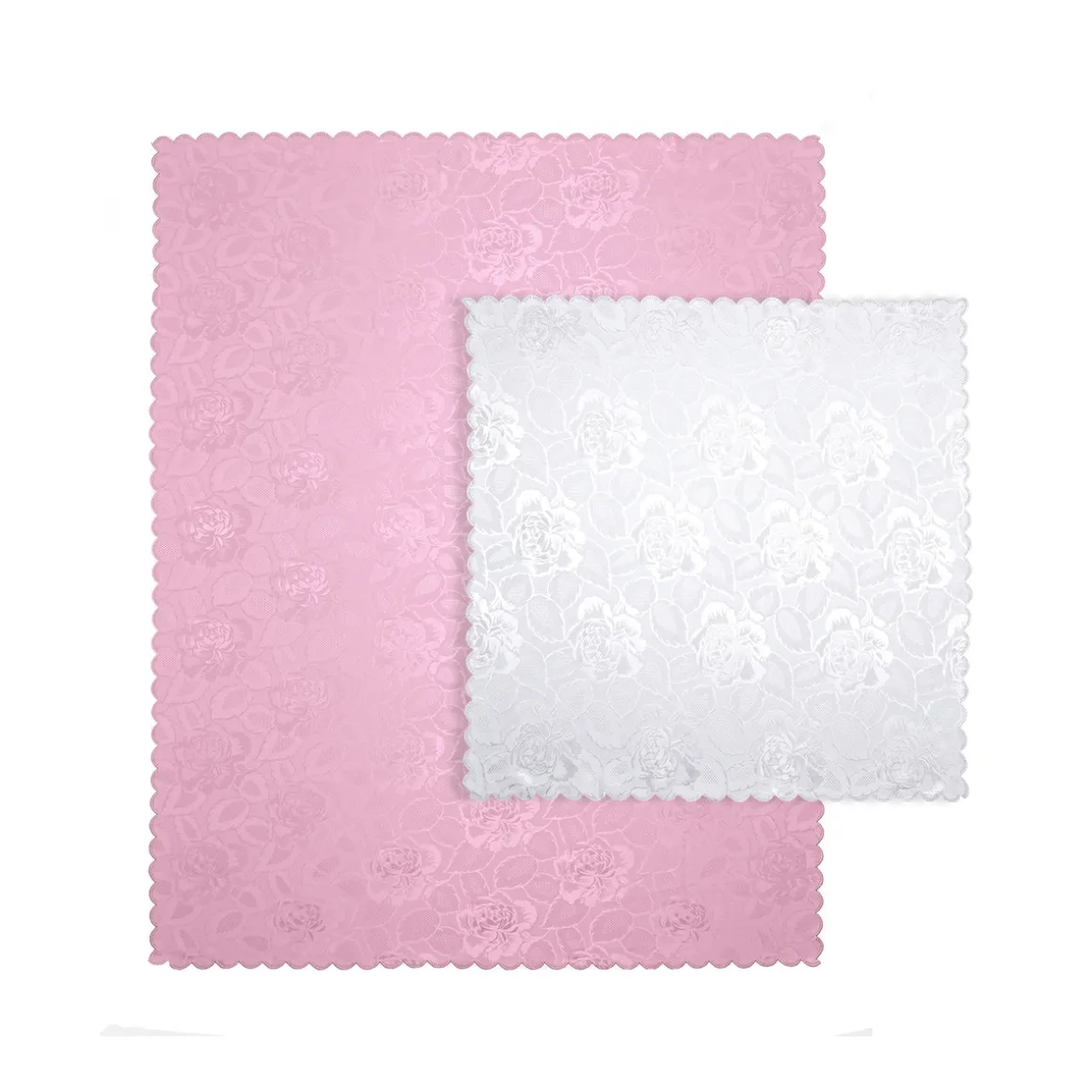 Abmessungen: Mitteldecke weiß (LxB) 80×80 cm, Tischdecke rosa: (LxB) 160×130 cm