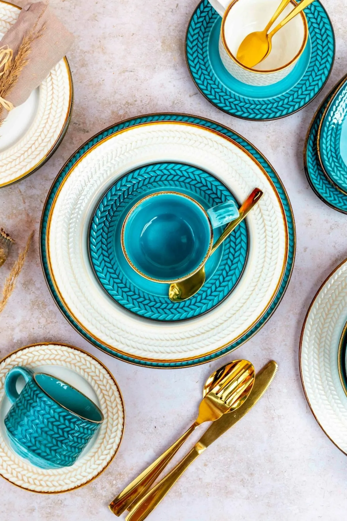 Aufregend exquisit präsentiert sich die ausdrucksstarke Premium-Kollektion „Prospero“ der österreichischen Traditionsmarke MÄSER. Eine an geschichtsträchtige Lorbeerkränze erinnernde, haptisch fühlbare Reliefstruktur umläuft ein handgepinseltes Spiraldekor, welches jedes Teil zu einem echten Unikat macht. Gefertigt aus robustem und langlebigem Durable Porzellan in dickwandiger, schwerer Qualität erfüllt diese Tafelgeschirr-Serie die besonderen Ansprüche der gehobenen Gastronomie und anspruchsvoller Privatkunden. Die einzigartige Kombination aus fließender Dynamik und selbstbewusster Eleganz wird sanft eingerahmt durch eine händisch aufgemalte, unregelmäßig schimmernde ockerfarbene Umrandung. Die sorgfältig aufeinander abgestimmten Farben dieser Kollektion ermöglichen einen täglich neu erschaffenen Esstisch, der optisch perfekt zu Ihren Speisen passt. Selbstverständlich ist die gesamte Serie „Prospero“ mikrowellengeeignet und dauerhaft spülmaschinenfest. Dieses Set wird in einer sicheren Transportverpackung aus ressourcenschonenden Materialien versendet. Bitte beachten Sie: Für eine objektive Vergleichbarkeit gehen unsere Füllmengenangaben von einer randvollen Befüllung aus. Aufgrund des hohen handwerklichen Anteils sind kleine Unregelmäßigkeiten und Farbabweichungen in der Glasur möglich.