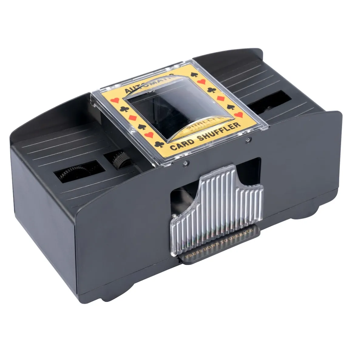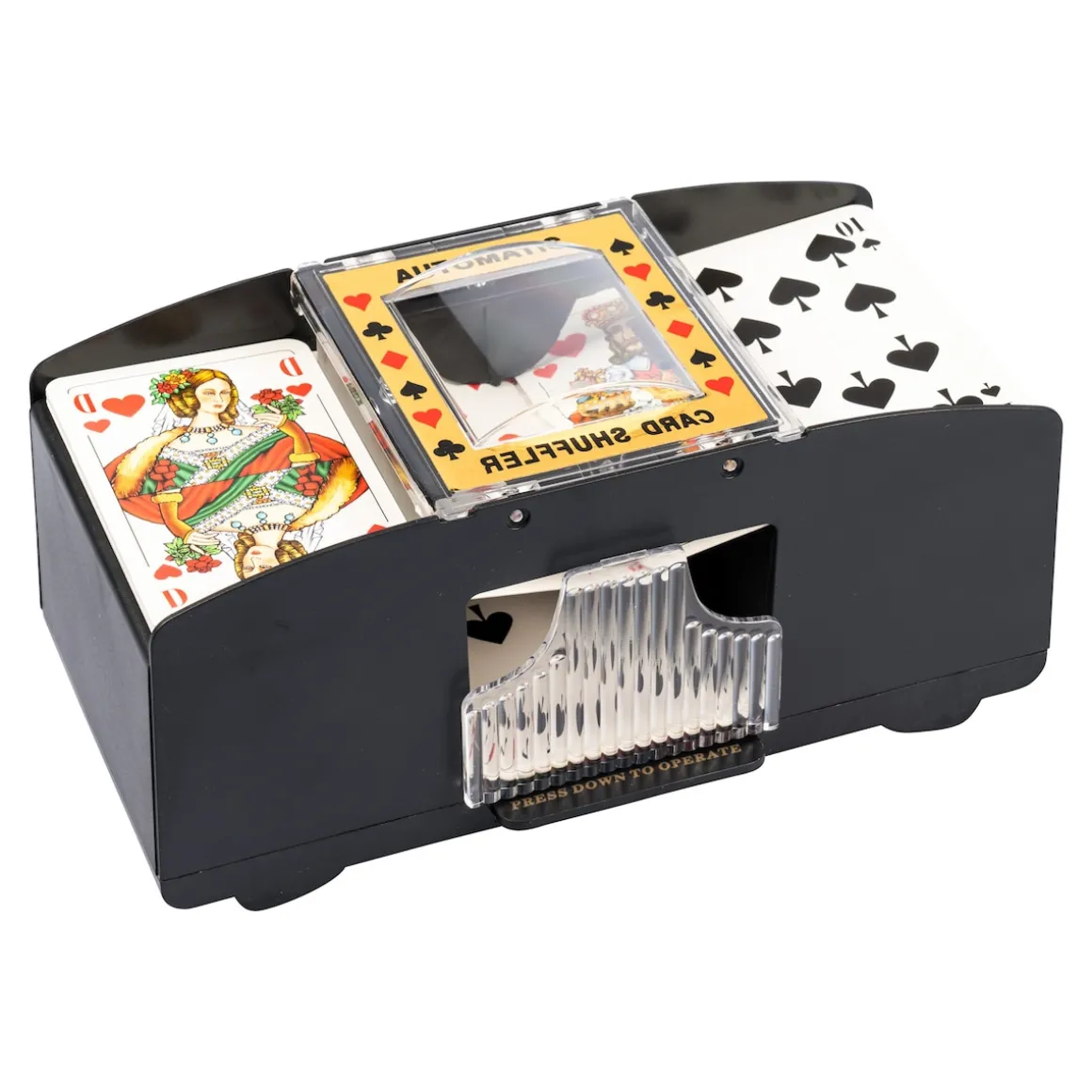 Überlassen Sie Ihre Decks dem Kartenmischer – so haben Sie mehr Zeit fürs Spiel. Rechts und links je einen Stapel Karten einlegen, Knopf drücken und schon werden die Karten sorgfältig vermischt – und der fertig gemischte Stapel kann in der Mitte entnommen werden. Geeignet für alle Karten in Standardgröße.