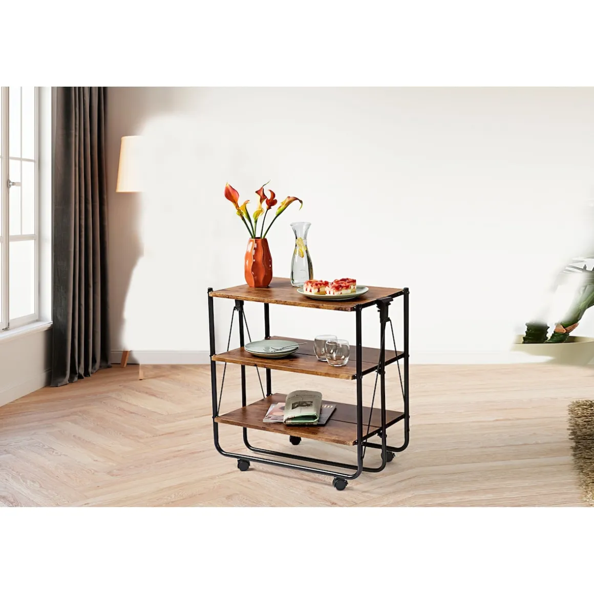 Mit unserem klappbaren Servierwagen in edler Holzoptik wird das Servieren zum echten Vergnügen! Dank der leichtgängigen Rollen bewegen Sie ihn mühelos von Raum zu Raum, während sein geräumiges Design ausreichend Platz für Geschirr, Leckereien und Getränke bietet. Nach dem Einsatz lässt er sich spielend zusammenklappen und platzsparend verstauen. Genießen Sie die Eleganz und Funktionalität dieses praktischen Begleiters, der Ihnen bei jeder Gelegenheit zur Seite steht!