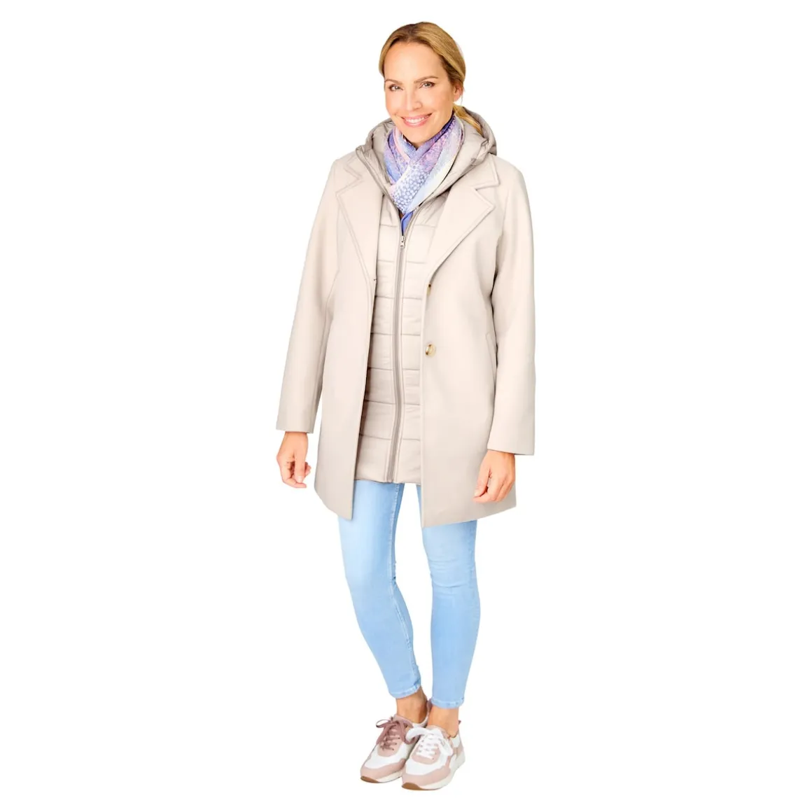 Perfekt für jede Wetterlage: Mit diesem vielseitigen Kombimantel sind Sie stets passend gekleidet. Ob als Mantel, Steppweste oder in Kombination – er bietet Ihnen flexible Tragemöglichkeiten für jeden Anlass. Steppweste mit Kapuze, Reißverschluss und Seitentaschen. Mantel mit Knöpfen und Seitentaschen.