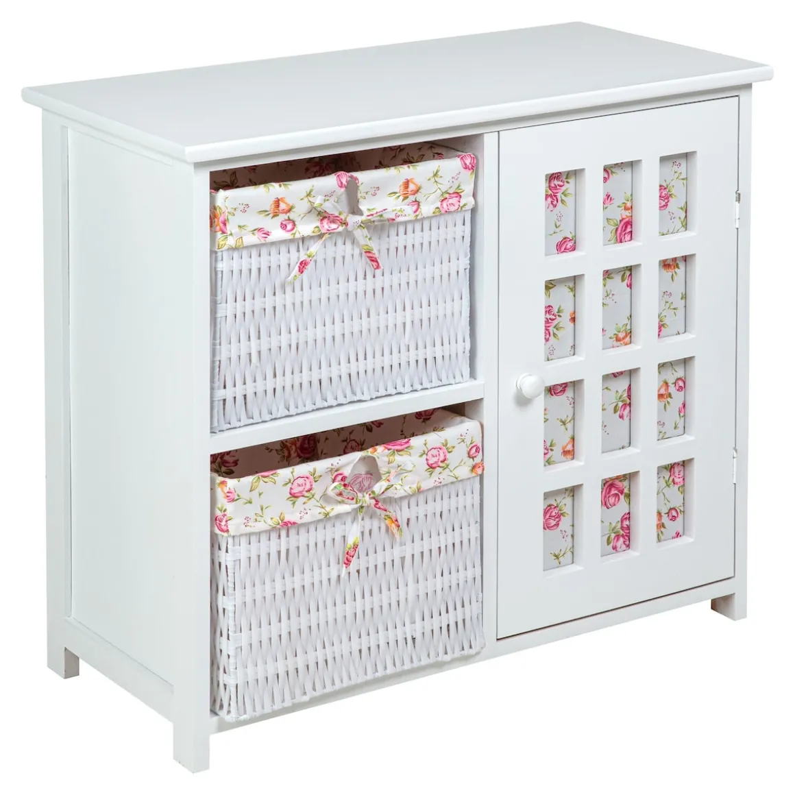 Die Kommode verleiht Ihrem Eingangsbereich oder Wohnraum nostalgischen Charme. Mit einer Tür und zwei praktischen Körben bietet sie Platz für all die Kleinigkeiten, die sonst herumliegen würden. Die dekorativen Rosen-Highlights machen sie zu einem stilvollen und funktionalen Möbelstück!