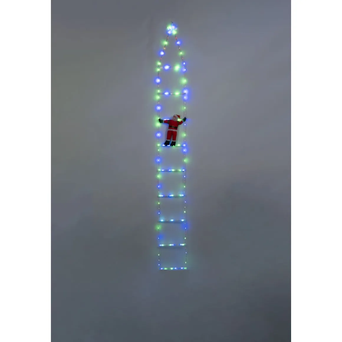 Weihnachten ist zum Greifen nah – der Weihnachtsmann erklimmt zielstrebig die bunt blinkenden Leitersprossen bis hinauf zum hell strahlenden Stern. Mit 8 verschiedenen Leuchtmodi sorgt die Leiter für magische Lichtmomente, die drinnen wie draußen für festliche Stimmung und leuchtende Augen sorgen. Dank der einfachen Befestigung mit Klettverschluss-Schlaufen lässt sich die Leiter im Handumdrehen sicher anbringen.