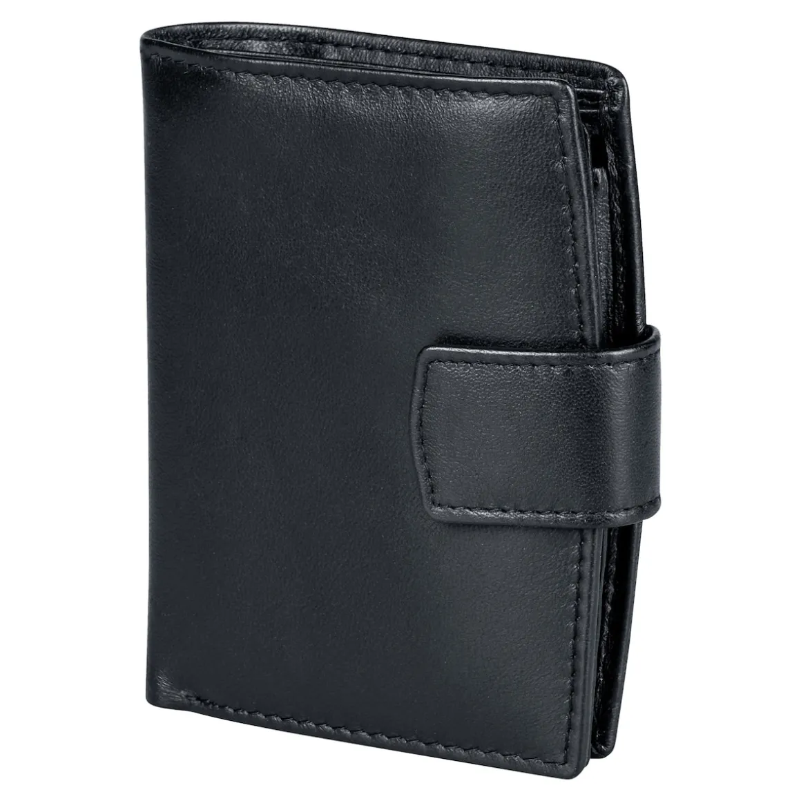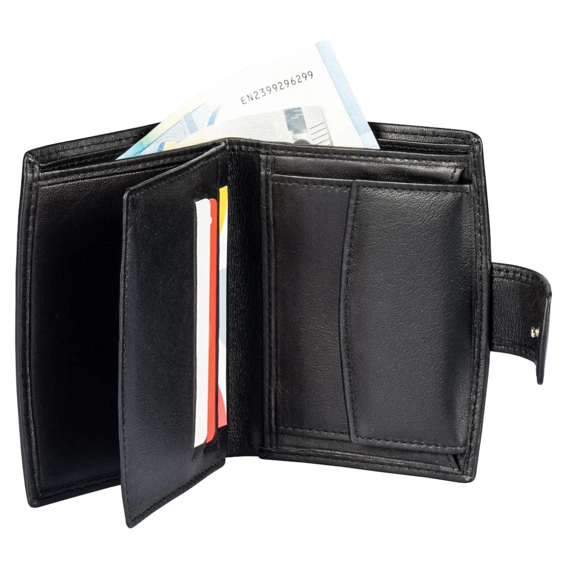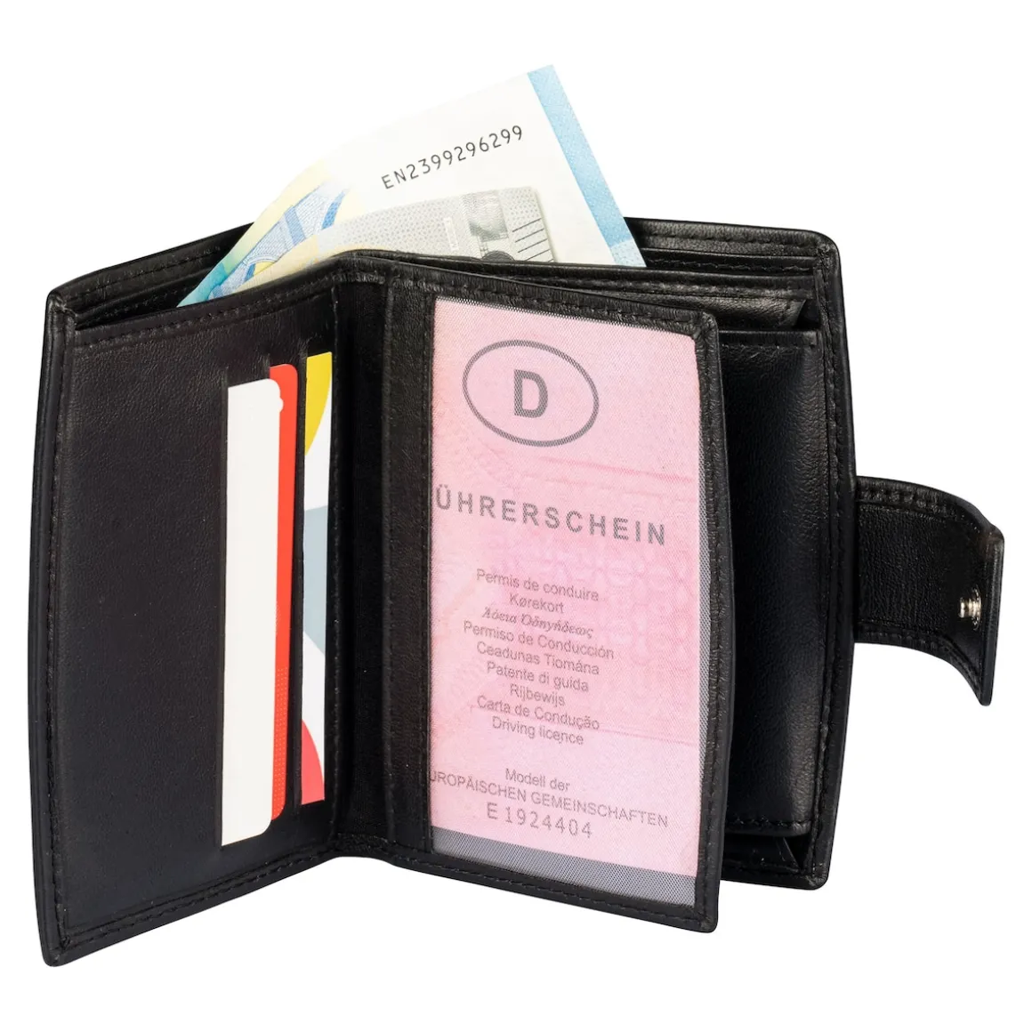 Alles Wesentliche findet in dieser Börse Platz: Ihr Kleingeld im Fach mit Druckknopfverschluss sowie Führerschein und Ausweis im Klarsichtfach. 6 Kartenfächer, 2 Scheinfächer und 3 weitere Dokumentenfächer nehmen Wichtiges entgegen und der Außenriegel sorgt für einen sicheren Verschluss.