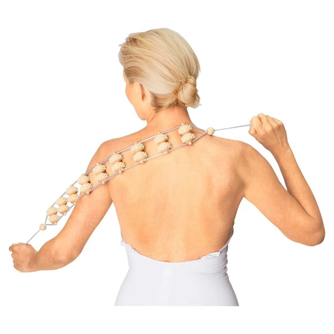 Mit dem Massage-Seil und seinen 18 genoppten Rollen erreichen Sie auch schwierige Körperstellen ohne Hilfe anderer und können eine wohltuende Massage genießen und dabei Ihre Muskeln lockern, die Durchblutung fördern und das Wohlbefinden verbessern.