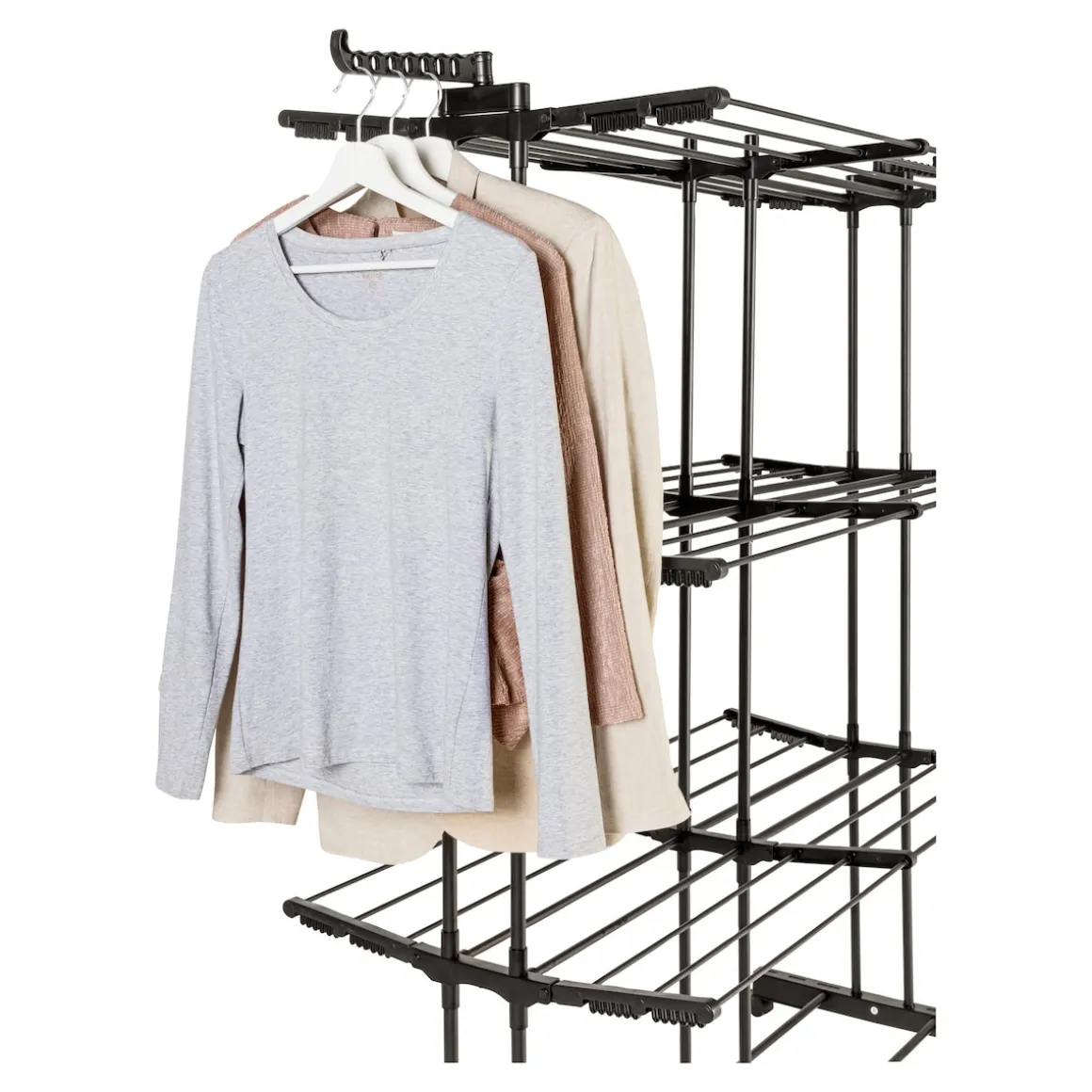 48 Trockenstangen auf 3 Ebenen – so viel Platz bietet kaum ein anderer! Dieser stabile Maxi-Wäscheturm ist bis zu einer Breite von 180 cm ausziehbar und passt sich so immer den Raum- und Wäscheverhältnissen an. Nach Gebrauch im Nu zusammengeklappt und verstaut. Leicht verschiebbar dank Rollen. Trockenfläche: bis zu 40 m.
