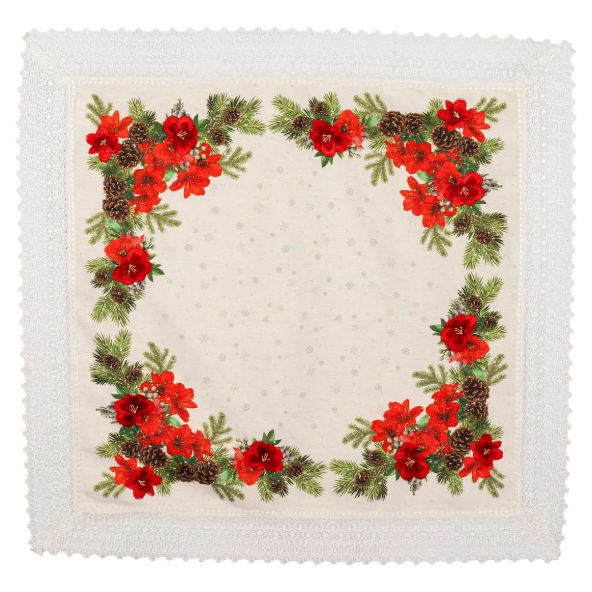 Mit ihren imposanten Blüten ist die Amaryllis ein beliebtes Weihnachtssymbol. Lassen Sie in diesem Sinne auch Ihr Zuhause gebührend weihnachtlich aufblühen: Halb bestickt, halb bedruckt veredelt sie als Mitteldecke den Tisch.