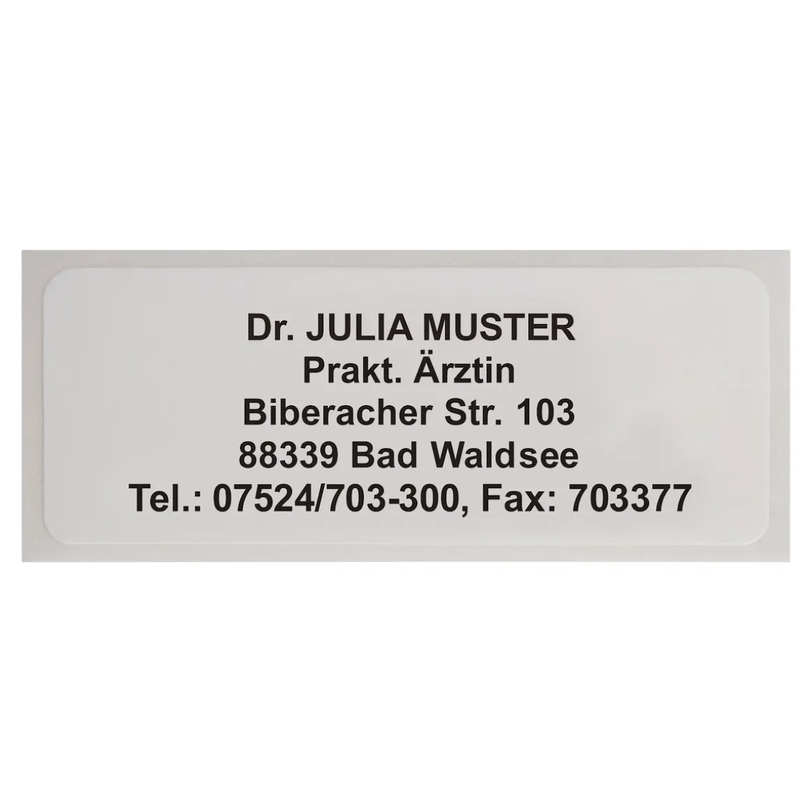 Bei diesen Namensaufklebern haben Sie die Möglichkeit, fünf Zeilen mit bis zu 30 Zeichen pro Zeile drucken zu lassen. Geben Sie hierzu bei der Bestellung einfach Ihren persönlichen Text in die entsprechenden Felder ein. Es stehen zwei Packungsgrößen zur Auswahl: 300 Stück und 1.000 Stück. Außerdem können Sie zwischen verschiedenen Farben (rot, blau, schwarz, silber, gold) wählen.