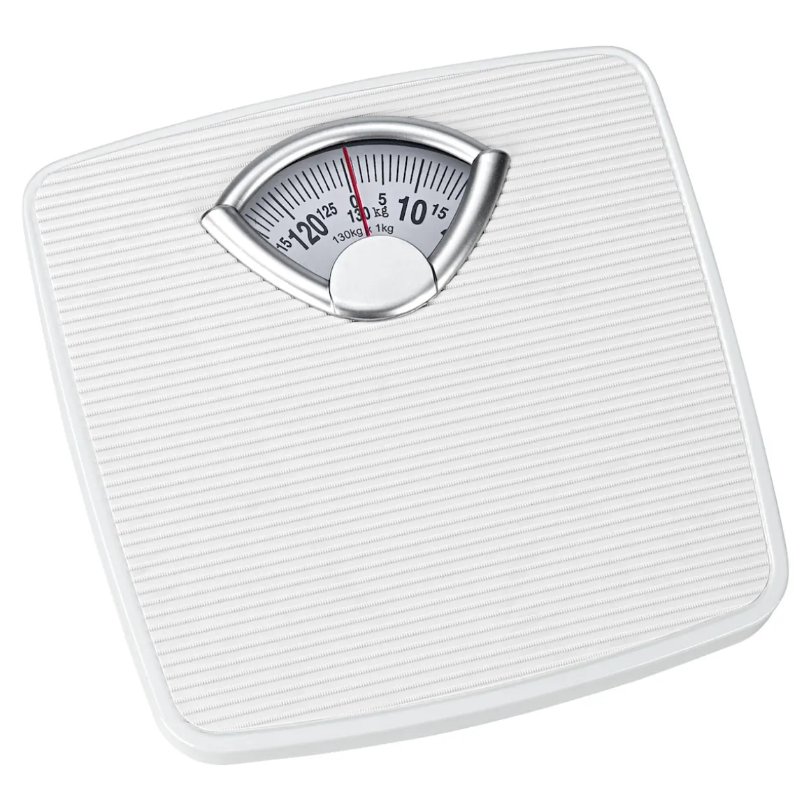 Mechanische Waage mit Anti-Rutsch-Oberfläche für sicheren Stand. Messbereich bis 130 kg. Justierrad für genaue Ergebnisse.