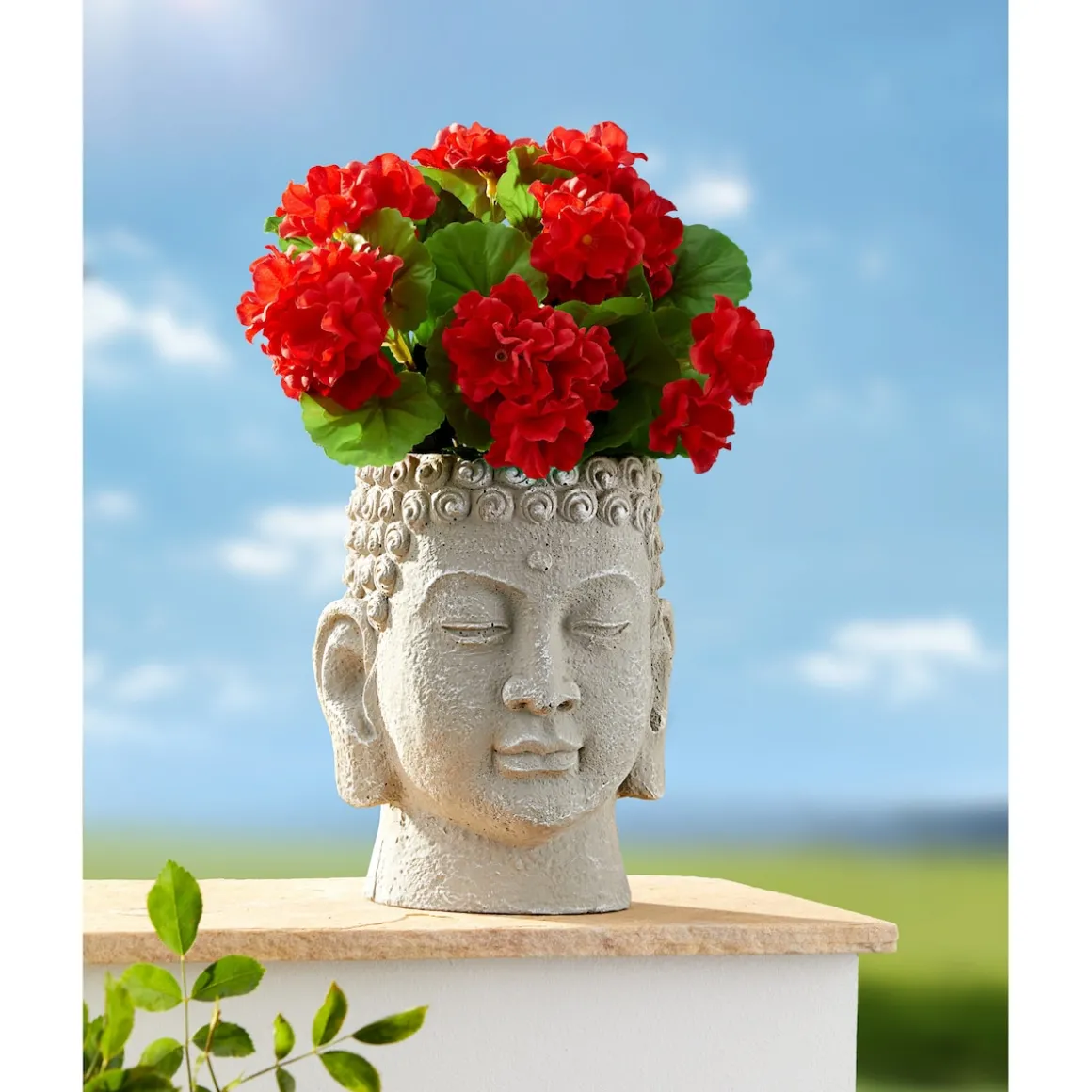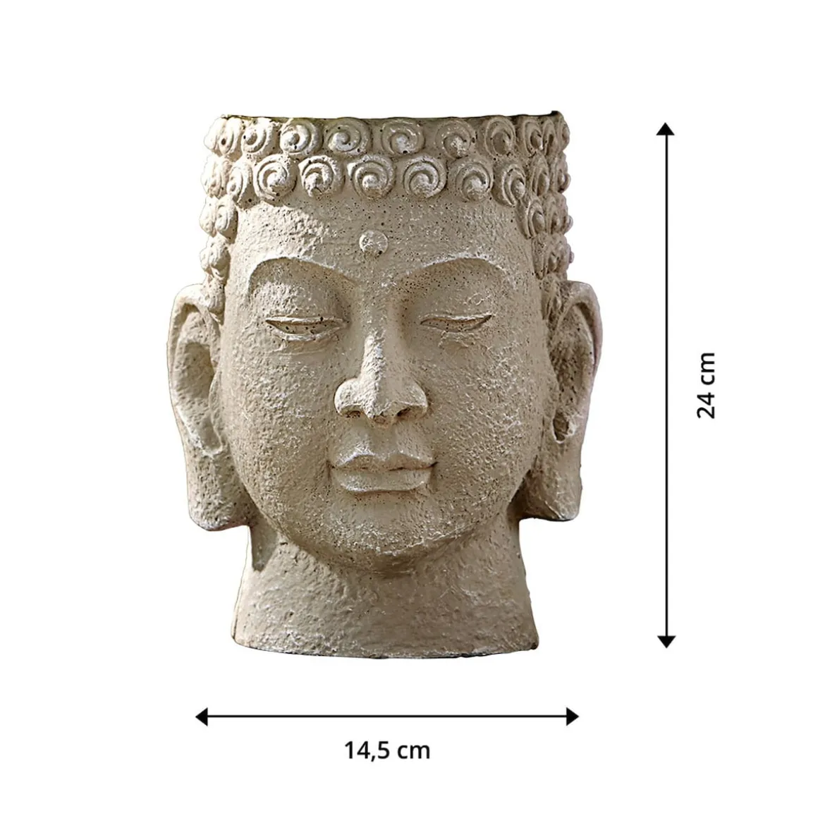 Dieser wetterfeste und kunstvoll gestaltete Buddhakopf entlockt Ihren Gästen nicht nur bewundernde Blicke, sondern sorgt auch für fernöstliches Flair im eigenen Garten. Die mitgelieferte Buchsbaumkugel kann – je nach Saison – ausgetauscht und z. B. mit Geranien bepflanzt werden.