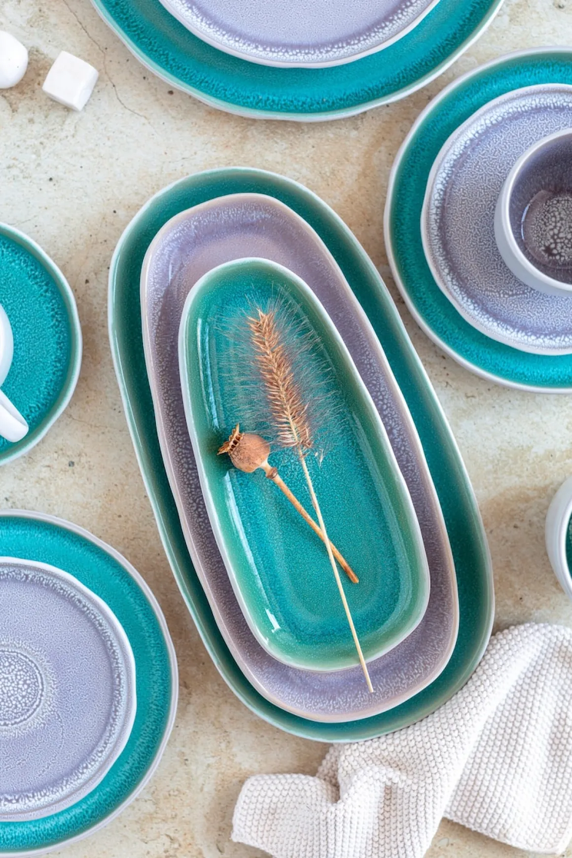 Mit der stilvollen Serie ELEA bringen Sie modernes, harmonisches Flair auf Ihren Esstisch. Die Außenseite in weißer Hammerschlagoptik bildet einen spannenden Kontrast zur türkisfarbenen Reaktivglasur im Inneren – jedes Teil erhält so eine einzigartige Handmade-Optik mit Unikatcharakter.